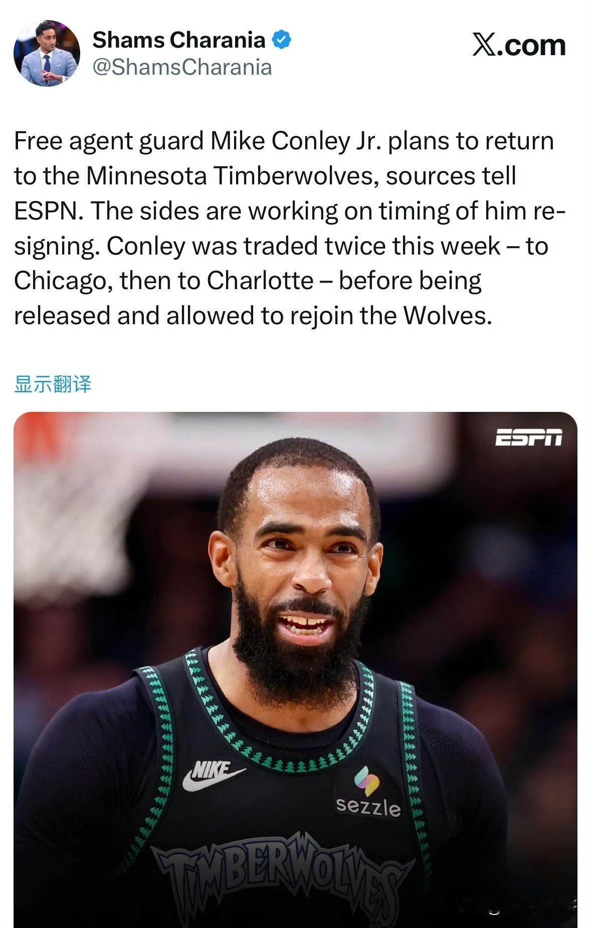 被交易两次后又回来了!!!康利将重返森林狼! 根据记者Shams最新消息透露,老将后卫迈克-康利将重返森林狼,目前双方正协商重新签约的具体时间。 这对森林狼、华子以及戈贝尔来说是个好消息,康利是一个老好人,球员们都很喜欢他,如今他能以自由球员身份回归无疑是振奋人心的事情,华子还承诺要给康利拿下一个冠军呢。 交易截止日前,康利先后被交易至公牛和黄蜂,最后被黄蜂裁掉,根据联盟中的大Z规则,此情况下他是可以签约森林狼的,而如果他是被公牛裁掉的,那么他将不能和森林狼重新签约,这就是限制。 康利表示,我行李都还没打包,就这么转了一圈又回来了! 这么传统的后卫火箭竟然一点也不考虑,也注定了他们本赛季的结局。我的年度菱感记忆 火箭 森林狼 康利