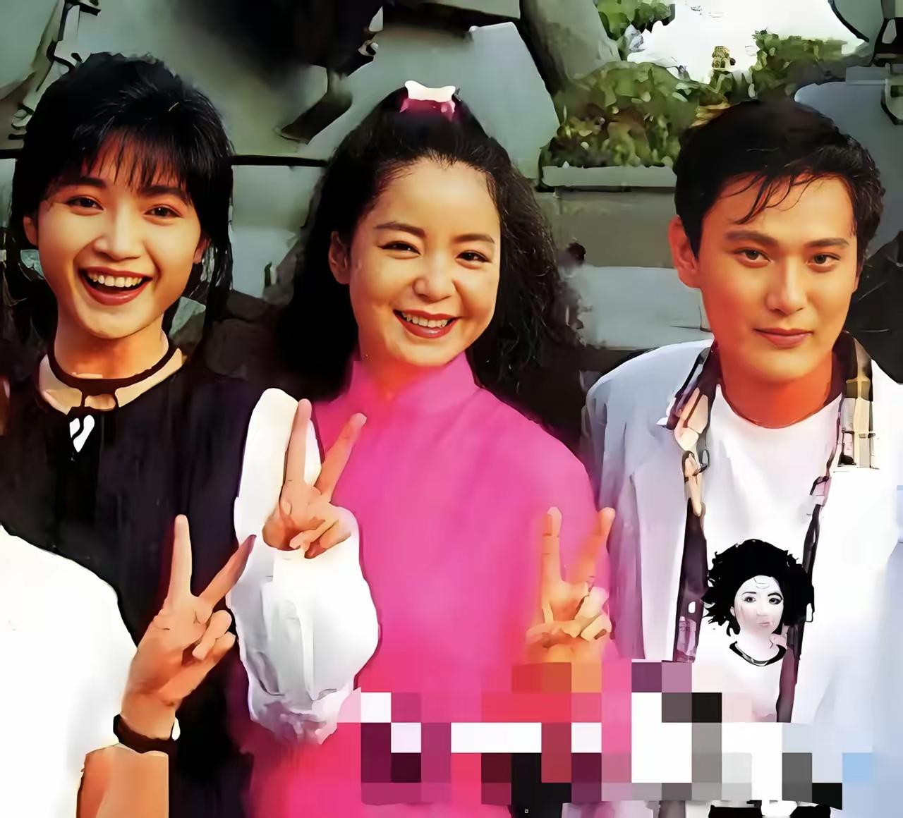 一张老照片:我只认出了身穿粉色上衣、笑容灿烂的''甜歌皇后''邓丽君与疏眉朗目的''情歌王子''张信哲,慧眼如炬的你能认出左侧那位双瞳剪水的美女是谁吗?