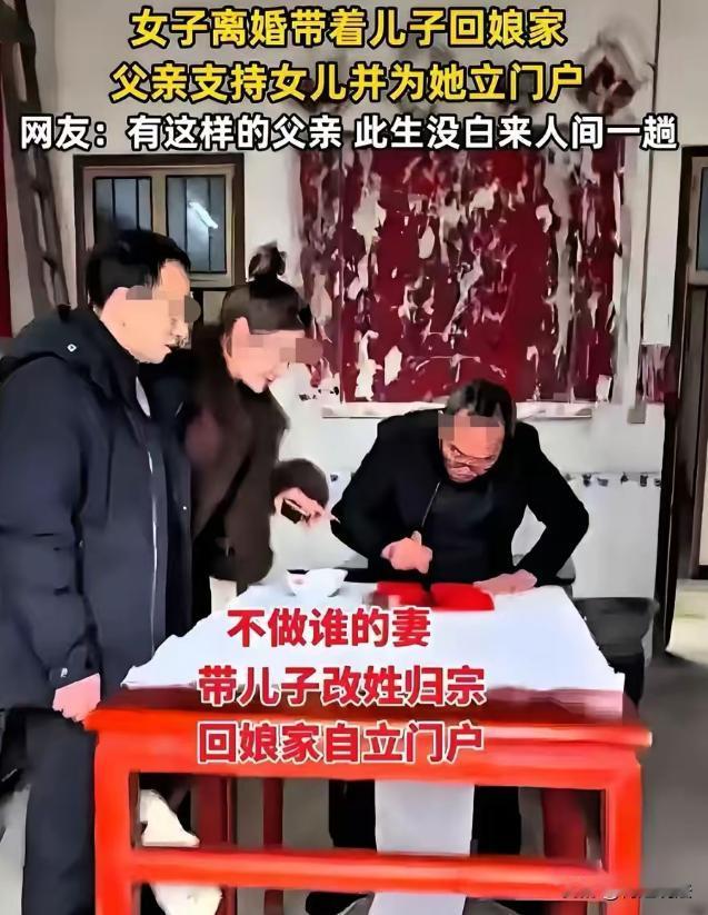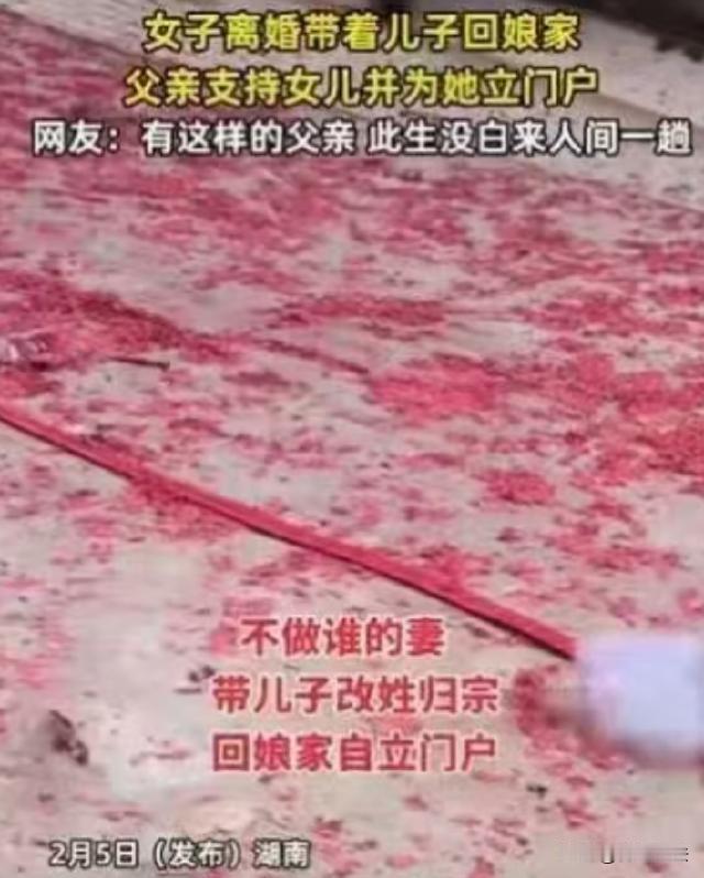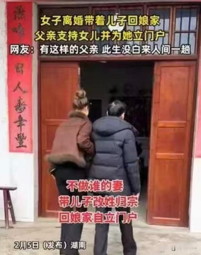湖南,一女子离婚后,带着儿子净身出户,走投无路打算回娘家。她满心忐忑,怕成娘家笑柄。可父亲见到女儿和外孙,立刻张开温暖怀抱,还带着外孙改姓,给女儿立门户,放上鞭炮欢迎女儿归家。 女子,刚从一段痛苦婚姻里挣脱出来,离婚时,她啥都没要,就带着儿子,净身出户。拖着几件行李,牵着年幼儿子,她迷茫走在路上,心里乱糟糟的,不知道以后日子咋过,咋把儿子养大。 刚走出婚姻阴影,未来又迷茫得不行,她觉得自己没家了,走投无路。她不想带着儿子露宿街头,想堂堂正正、有尊严地生活,可眼下能落脚的地方,只有娘家。 可她心里犯嘀咕,一个离了婚的女人,带着儿子回娘家,这算咋回事儿? 她怕丢脸,怕别人说三道四,说她30多岁,婚姻搞砸,只能回娘家靠父母,给娘家抹黑。她也怕成娘家负担,自己没工作,儿子以后上学得花钱,她怕养不起儿子,拖累娘家。 更让她害怕的是,左邻右舍会说闲话,毕竟嫁出去的女儿泼出去的水,她连婚姻都经营不好,还得娘家养着,这多丢人。她越想越害怕,回娘家的脚步变得沉重又犹豫,可看着儿子,她只能硬着头皮往家走。 她以为,娘家人看到她回来,会投来异样眼光,说不定还会嫌弃她。可她没想到,父亲早就把小院子打扫得干干净净,看到她和外孙,父亲张开双臂,给了她一个温暖拥抱,又抱起外孙,欢迎他们回家。 父亲啥都没说,没提离婚这俩字,就领着她们到独立小院,说:以后这就是你们的家。 女子一听,眼泪就下来了,她这才明白,自己不是泼出去的水,还是父亲手心里的宝。 更让女子意外的是,父亲很快在族人面前给她立门户,说:从今往后,你就是赵家女,孩子带回来,我给你撑腰。 说完,父亲就点燃鞭炮,鞭炮声噼里啪啦响个不停,像是在欢迎她回家,又像是在告诉她,有娘家给她底气。 从那以后,女子不再是别人的妻,而是赵家女,儿子跟着她姓,父亲给她立了门户,让她有了尊严和底气。她心里那个感动啊,觉得自己太幸运了,有这样伟大的父亲。 好多离了婚的女子,带着孩子,婆家回不去,娘家也容不下她们。她们得一边工作,一边照顾孩子,生活没个依靠,过得那叫一个艰难,只有她们自己知道其中的苦。 就算有的女子回了娘家,也让父母抬不起头,说不定还会被哥哥嫂嫂嫌弃。她们别说有独立院子,能有个小房间住就不错了。在娘家,她们得小心翼翼,察言观色,活得一点尊严都没有。 可这个女子不一样,在父亲疼爱下,她慢慢走出离婚阴影。父亲的支持,让她有了勇气找工作,重新规划人生。她找到了工作,也找到人生方向,更找到离婚女子的尊严。 父亲用行动告诉女儿,不管遇到啥困难,娘家永远是她避风港。他让女儿知道,离婚不是世界末日,还有家人支持她,鼓励她重新开始。 女子也明白,父亲为她做了这么多,她得好好生活,不辜负父亲期望。她努力工作,照顾好儿子,让父亲看到,她能行,她能把生活过好。她感谢父亲,在她最困难时候,给她温暖和力量,让她重新站起来。 这事传出去,好多人都羡慕女子,说她有个好父亲。大家也觉得,父亲做法太对了,给离婚女儿底气和尊严,让她有勇气面对生活。 女子也希望,更多离婚女性,能像她一样,遇到困难别放弃,有家人支持,一定能走出困境,过上幸福生活。她知道,生活不会一帆风顺,但有父亲在,她啥都不怕。 父亲的爱,就像一盏明灯,照亮女子前行路。让她在黑暗中,看到希望,找到方向。她相信,未来日子,会越来越好,她和儿子,会一直幸福下去。 女子离婚后带儿子回娘家,父亲接纳并为其立门户,体现了家庭支持与亲情温暖。 但若从更广泛视角看,若女子离婚时未获得应有财产分割,根据民法典第一千零八十七条,离婚时夫妻共同财产应平等处理,若婆家隐瞒或转移财产,女子可依法追偿。 父亲让外孙改姓,虽属家庭内部事务,但依据民法典第一千零一十五条,子女可随父姓或母姓,父亲此举不违法,却可能引发关于姓氏权与家族传承的讨论。 毕竟,姓氏承载着文化认同,改姓虽合法,却也需考虑孩子未来感受。 有多少女性因离婚而陷入困境,娘家若能如这位父亲般给予支持,无疑是对她们最大的慰藉。 家是什么?家不是一座房子,而是有亲人在的地方,不管遇到啥困难,只要回到家,有亲人的陪伴和支持,就有了勇气和力量,去面对一切。 您觉得,应如何更好地保障离婚女性的权益,让她们在走出不幸婚姻后,能更有尊严地生活呢?