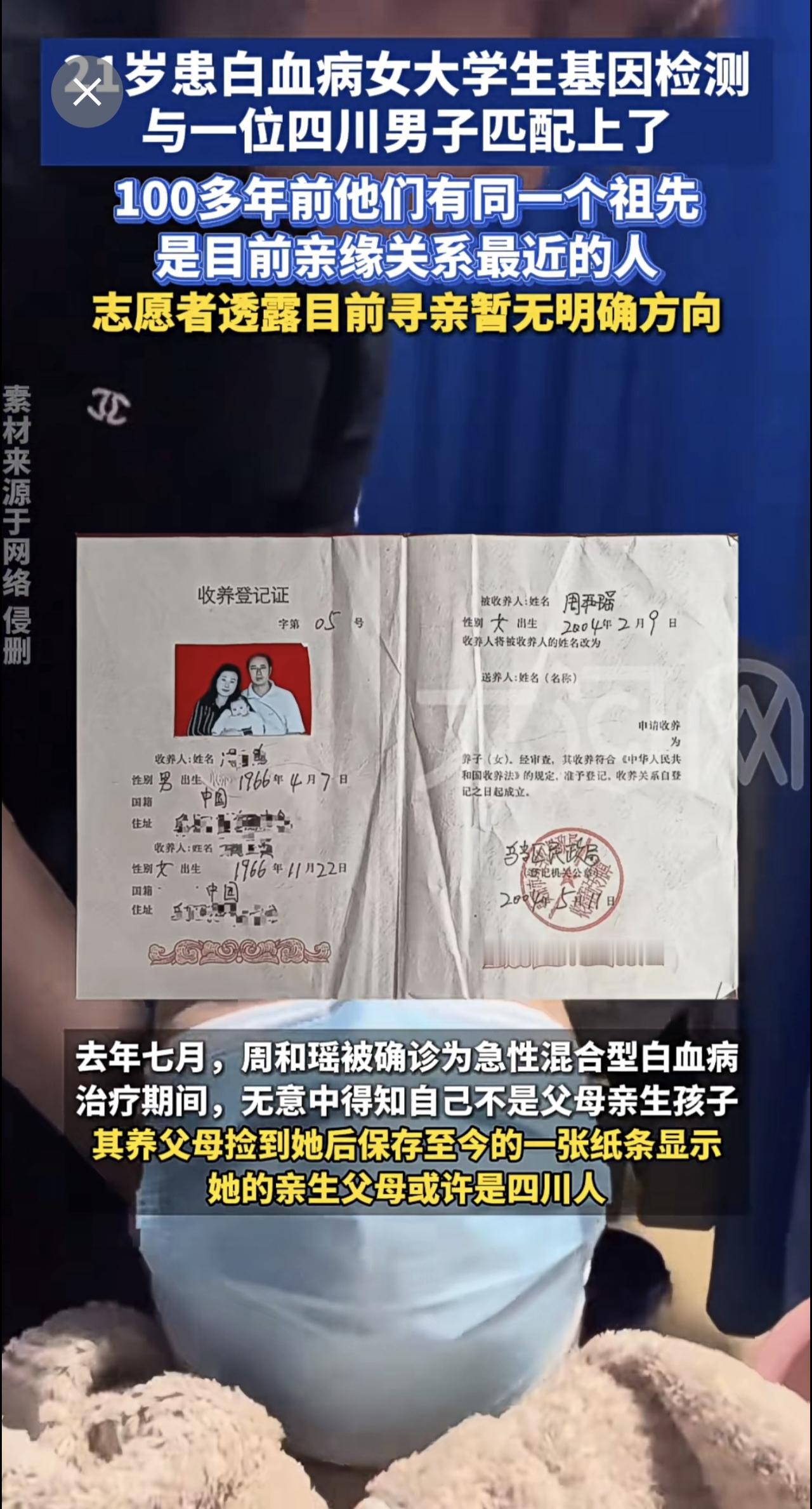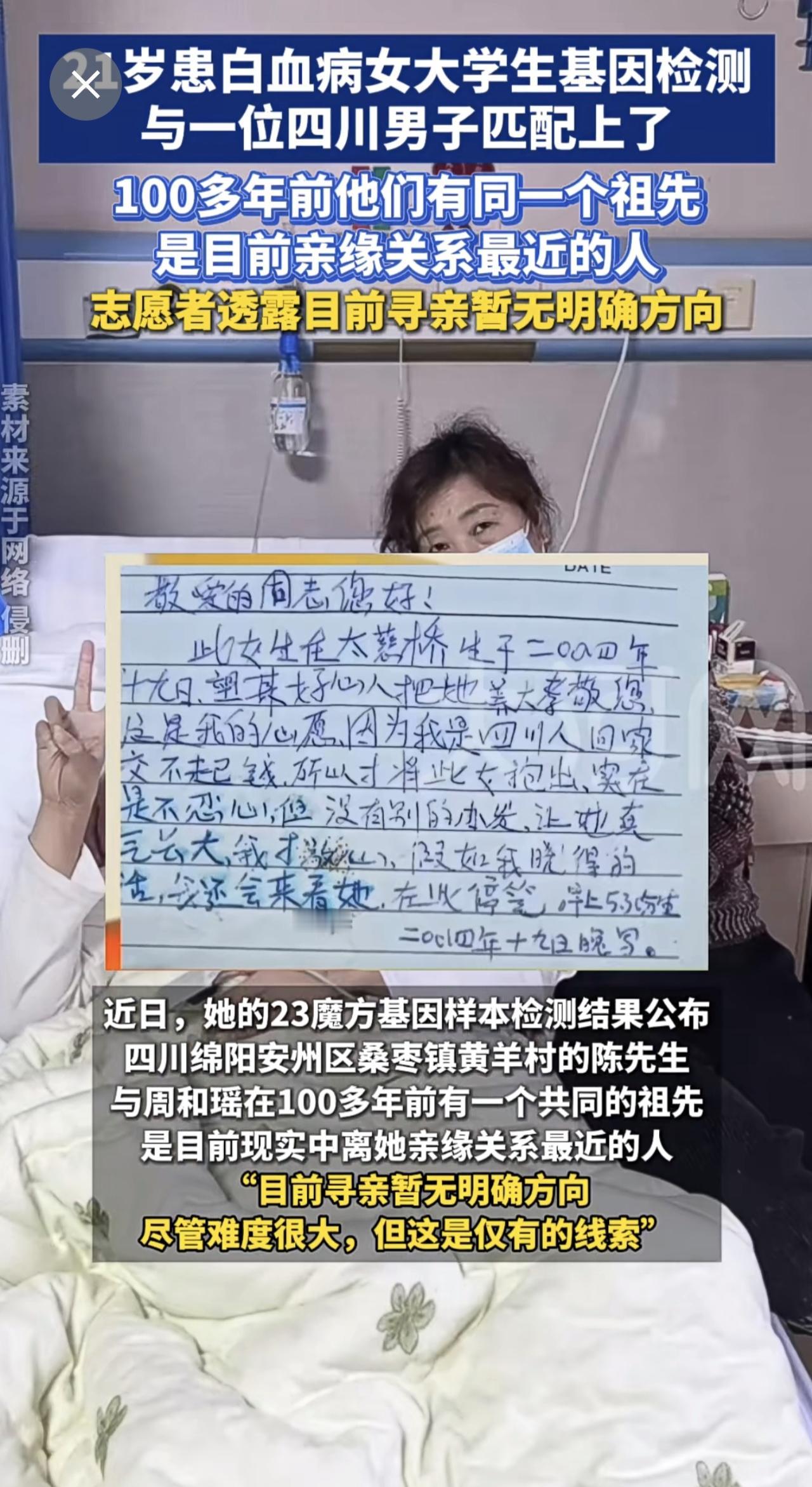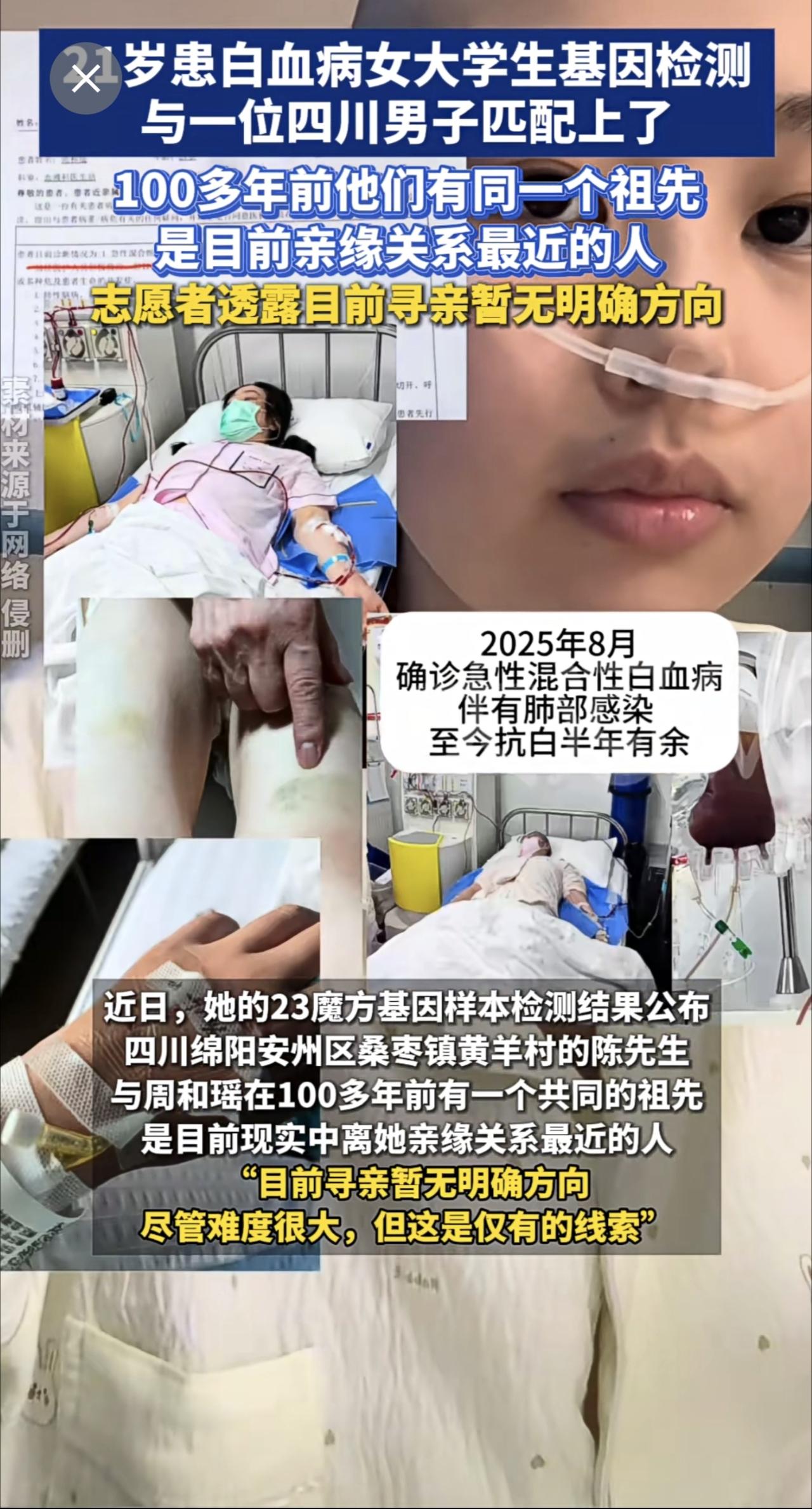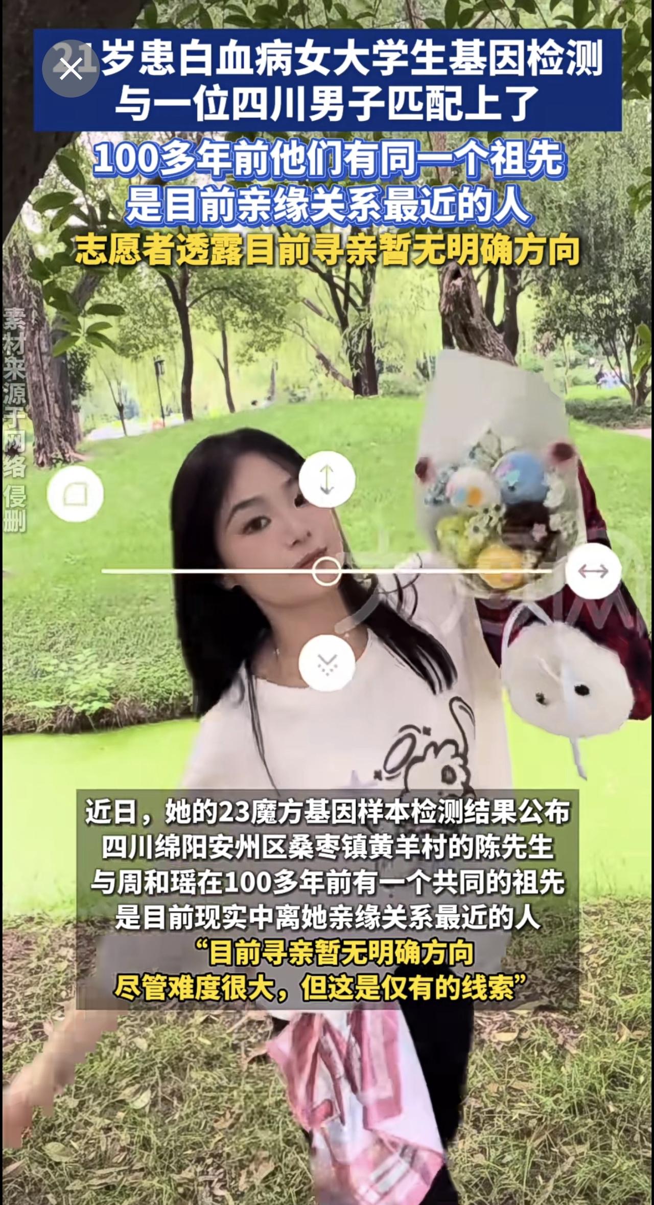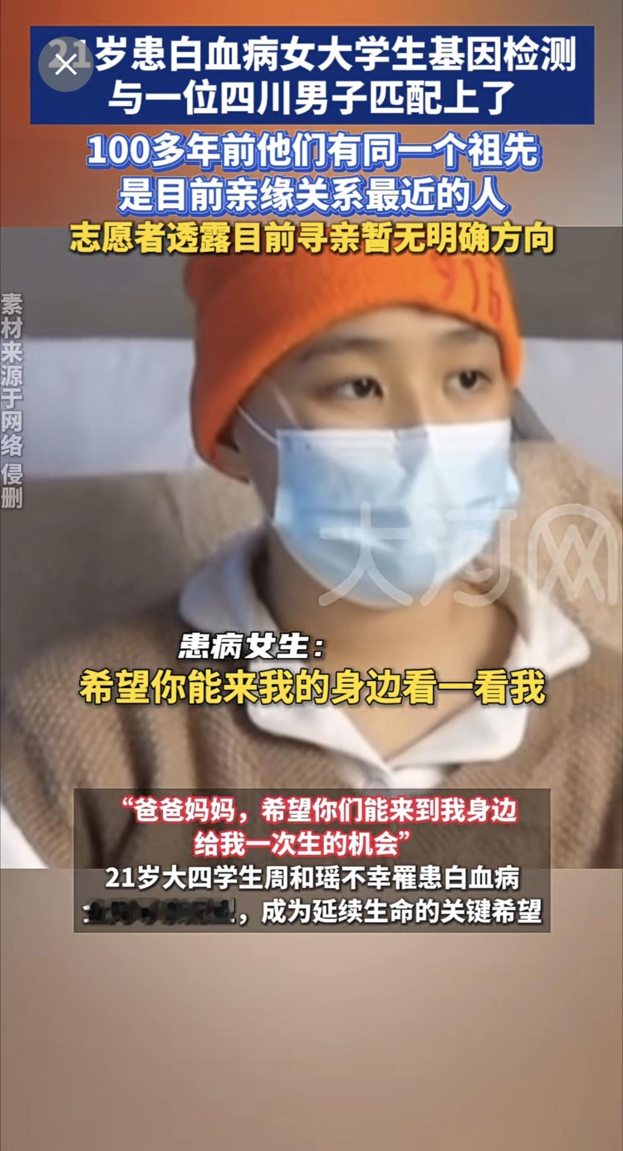 21岁患白血病女大学生基因检测与一位四川男子匹配上了,100多年前他们有同一个祖先,是目前亲缘关系最近的人。志愿者透露目前寻亲暂无明确方向。白血病