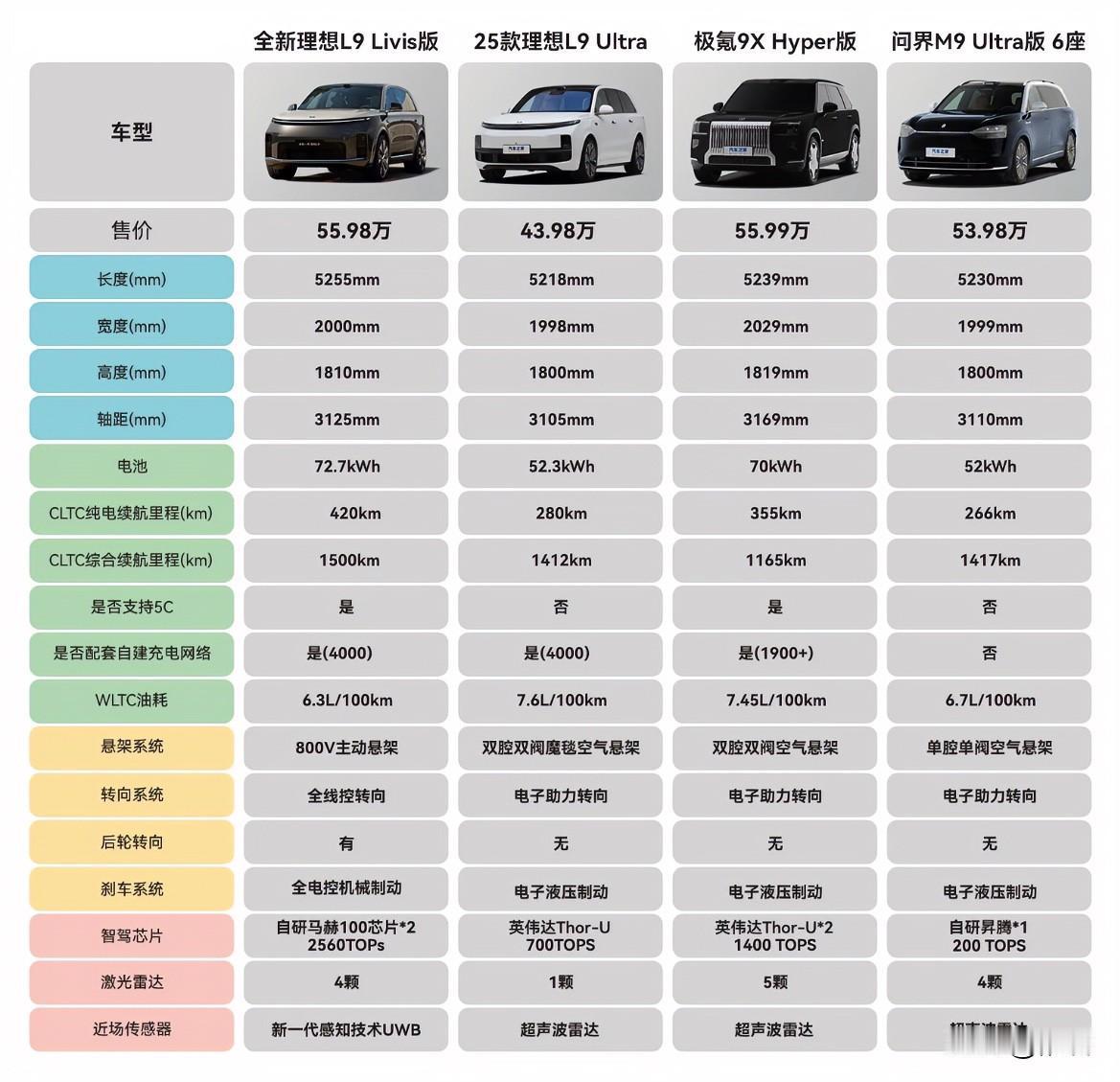 热门旗舰SUV的竞争将在2026年进入尾声,各家都将完全推出自己9系列SUV,包括小鹏GX和小米YU9。 就目前现有的车型而言,以下为市场表现的主观感受: 旗舰中的旗舰、最大最长:仰望U8 销量冠军:问界M9 智驾最强:问界M9 “冰箱彩电大沙发”的开山鼻祖:理想L9 颜值最高:理想L9 当前最畅销:蔚来ES8 最有气场:极氪9X