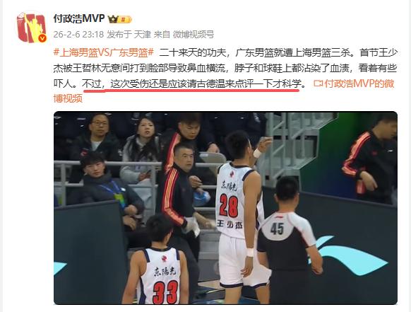 名记付政浩嘲讽上海队外援:王少杰被王哲林打到脸部导致鼻血横流,应该请古德温来点评一下才科学。众所周知,在上赛季山西最嚣张的外援是迪亚洛和古德温,他们两个把山西队带成了犯规大队和违体大队,在联盟遭到处罚次数最多,罚款金额最多,如此肮脏的一支球队却被某人说成是因为被他人侵犯多而导致犯规多,这真是胡说八道。 在粤沪二番战后,山西前外援古德温赛后再次惹事,发小作文对杜锋和广东队员进行造谣和中伤,称杜锋在裁判面前叫张皓嘉伤害他。上海队好事记者加以转发,信谣、传谣,影响极坏。我若是杜锋早状告古德温这家伙了。他听不懂中文,怎么知道杜锋叫队员伤害他呢?杜锋在裁判面前说这些话?为何裁判没有听到,为何裁判不给杜锋技犯或进行其他处罚?这说明古德瘟完全是一个招惹是非的外援。 上海打球也并不干净,昨晚杯赛中,王少杰被王哲林打到脸部导致鼻血横流,脖子和球鞋上都沾染了血渍,看着有些吓人。当然也许王哲林是无意间的行为。但是这说明双方打球的队员避免不了身体接触,也不存在哪一方是百分之百的干净。昨晚赛后名记付政浩就嘲讽了古德瘟,他说“这次王少杰受伤还是应该请古德温来点评一下才科学。实际上就是付政浩表达了对古德瘟的不满和批评。他在与球迷互动中也嘲讽了古德瘟。有球迷说请付老师出一篇今晚的武侠小说,喜欢看,爱看,并由中文听力十级的古德温评价一下。付政浩回复说:他的中文听力何止十级。可以看出,付政浩昨晚两次嘲讽了上海队好事外援古德瘟。 赢了一两场球就嘚瑟,上海外援、上海球迷和上海队那个跟队记者薛思佳们毫无必要惹事。上赛季上海队也嘚瑟,结果在季后赛被广东队收拾。昨晚广东队的开局就打得很好,全场分差也不大,获得外界的称赞,如果以后换掉萨林杰签来一个2.13米以上的大外援,季后赛与上海队有得打,请古德瘟不要嘚瑟,不要再被付政浩嘲讽。你们说呢?