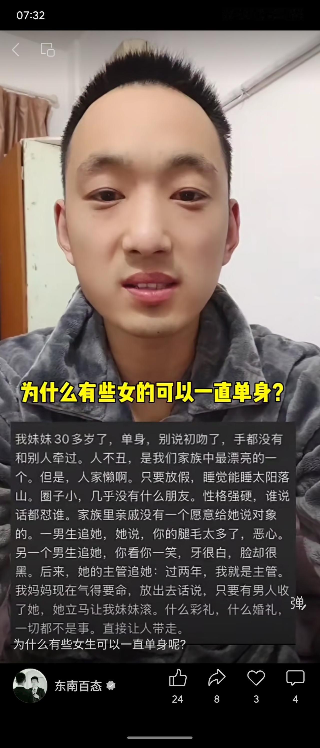 妹妹30多岁,虽貌美但懒惰、社交圈小、性格强硬,常以腿毛多、脸黑等琐碎理由拒绝追求者,亲友无人愿说媒。母亲气极,放言无需彩礼婚礼,只盼有人娶她。