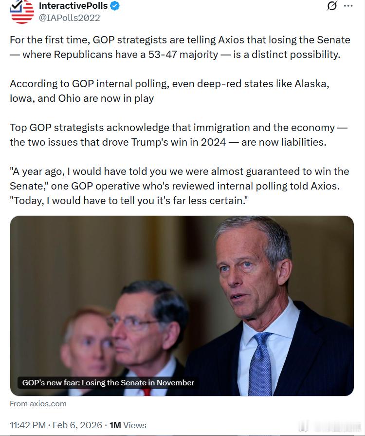 一位查看过内部民调的共和党工作人员告诉Axios:“一年前,我会告诉你,我们几乎可以确保赢得参议院。今天,我不得不说,这已远没有那么确定了。”