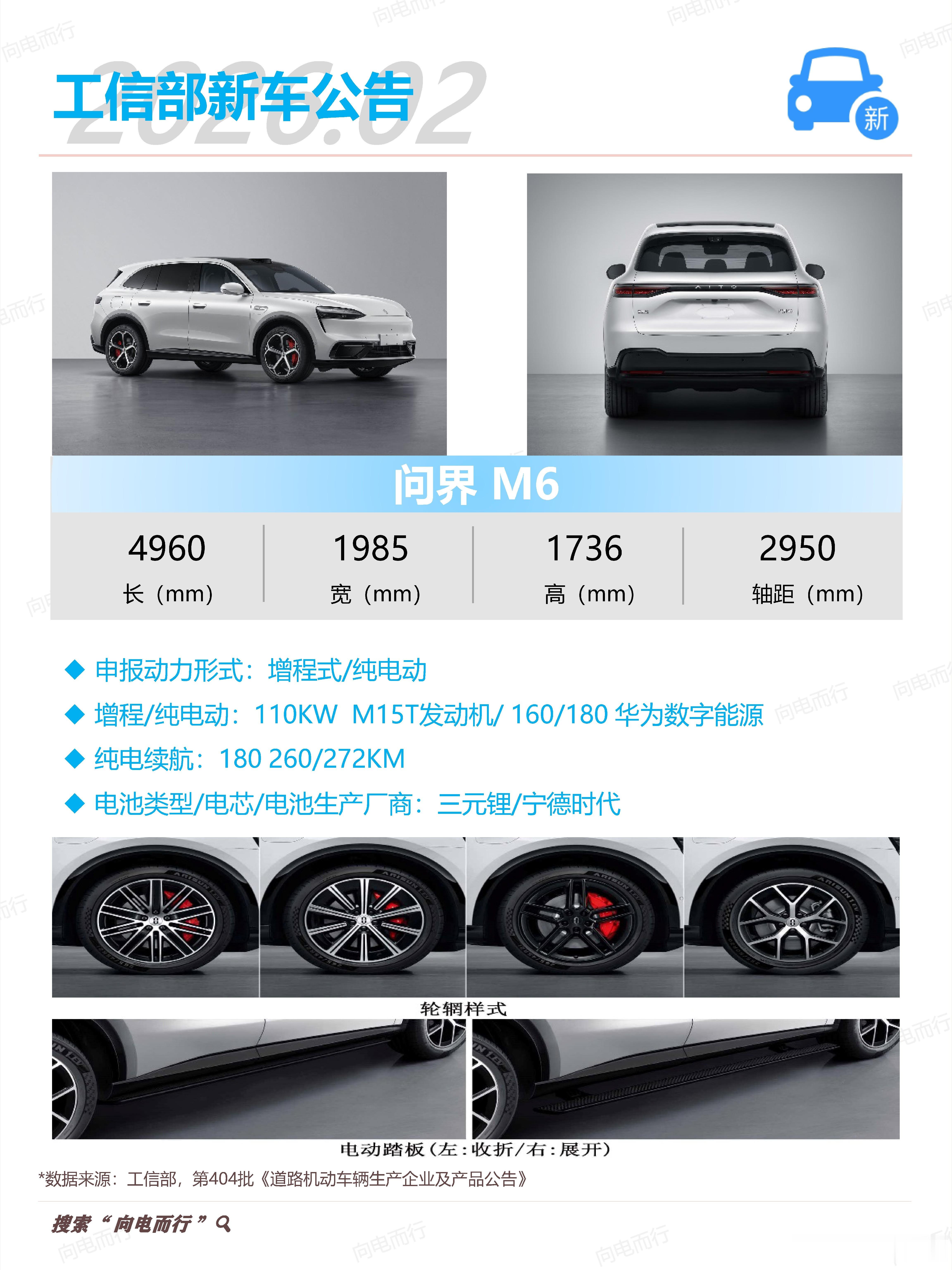 问界M6申报信息:4960×1985×1736mm,轴距2950mm。纯电增程双