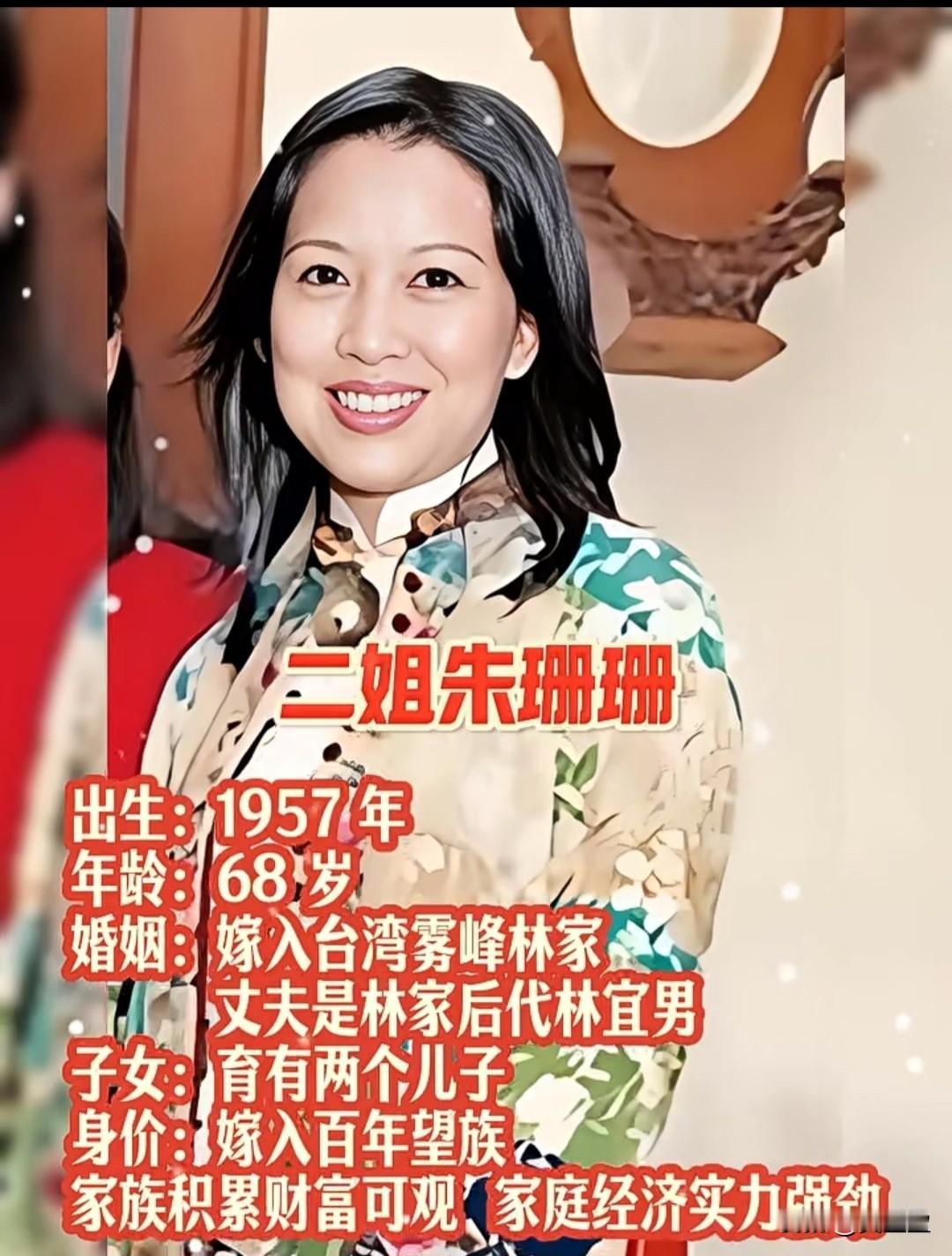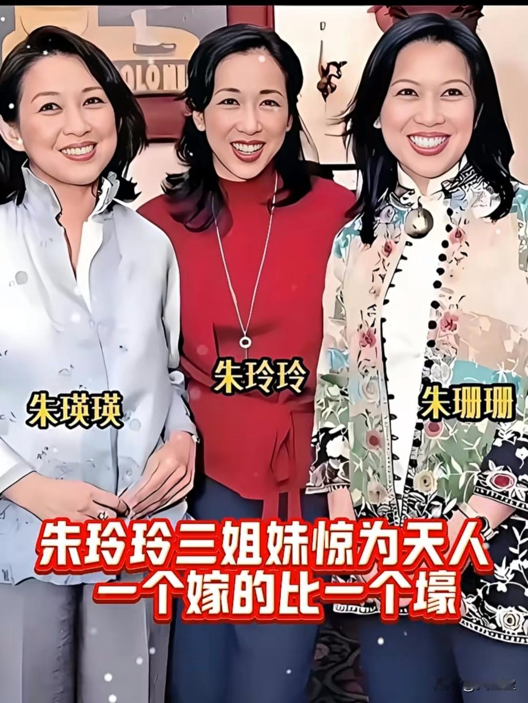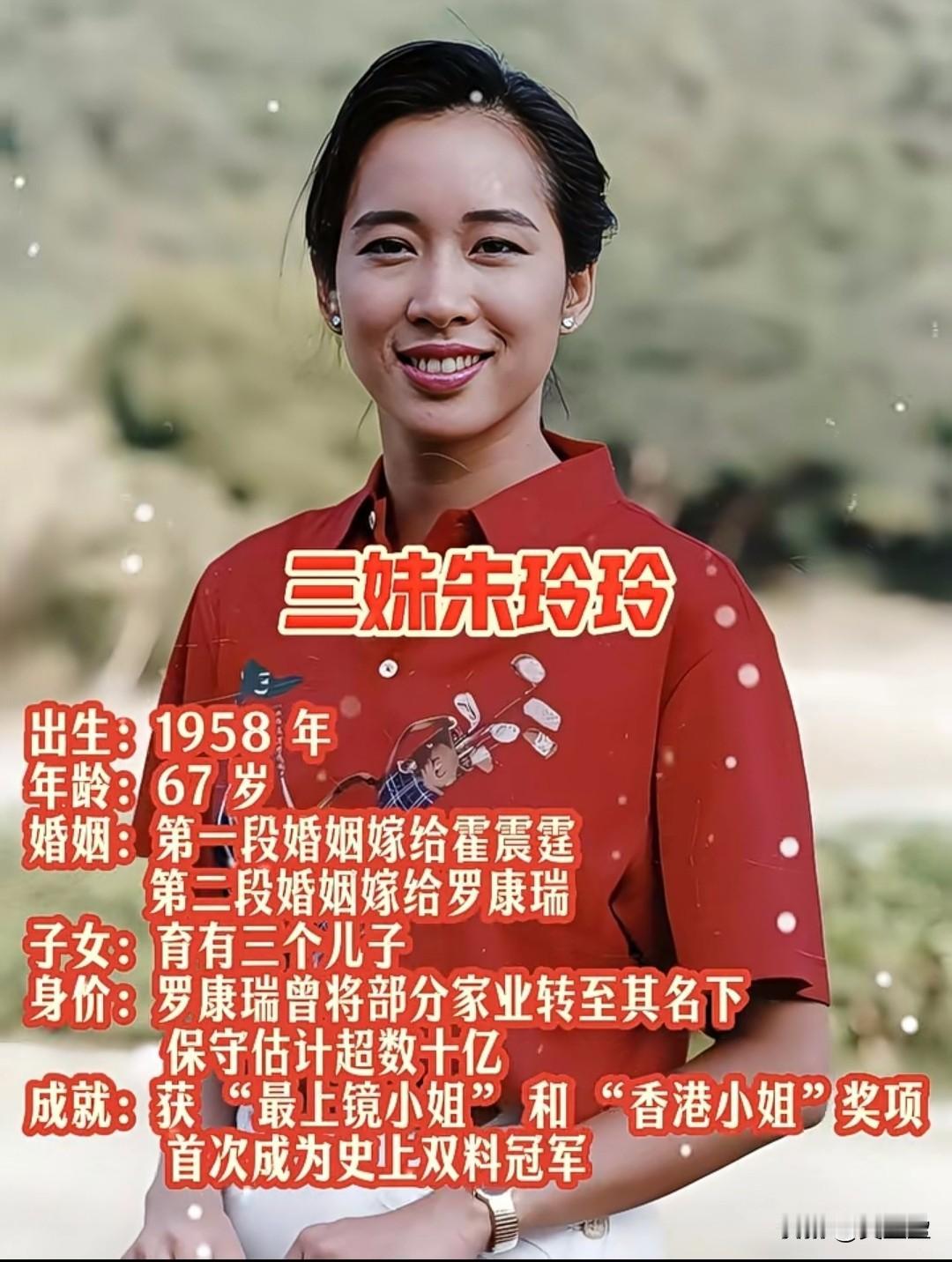 朱玲玲三姐妹惊为天人 一个嫁的比一个壕 大姐朱瑛瑛 - 出生:1956年 - 年龄:69岁 - 婚姻:嫁给金融圈大咖洪锦标 - 子女:育有一儿一女 - 身价:个人身价无确切公开数据,因丈夫是金融大佬,家庭资产雄厚 二姐朱珊珊 - 出生:1957年 - 年龄:68岁 - 婚姻:嫁入台湾雾峰林家,丈夫是林家后代林宜男 - 子女:育有两个儿子 - 身价:嫁入百年望族,家族积累财富可观,家庭经济实力强劲 三妹朱玲玲 - 出生:1958年 - 年龄:67岁 - 婚姻:第一段婚姻嫁给霍震霆,第二段婚姻嫁给罗康瑞 - 子女:育有三个儿子 - 身价:罗康瑞曾将部分家业转至其名下,保守估计超数十亿 - 成就:获“最上镜小姐”和“香港小姐”奖项,首次成为史上双料冠军