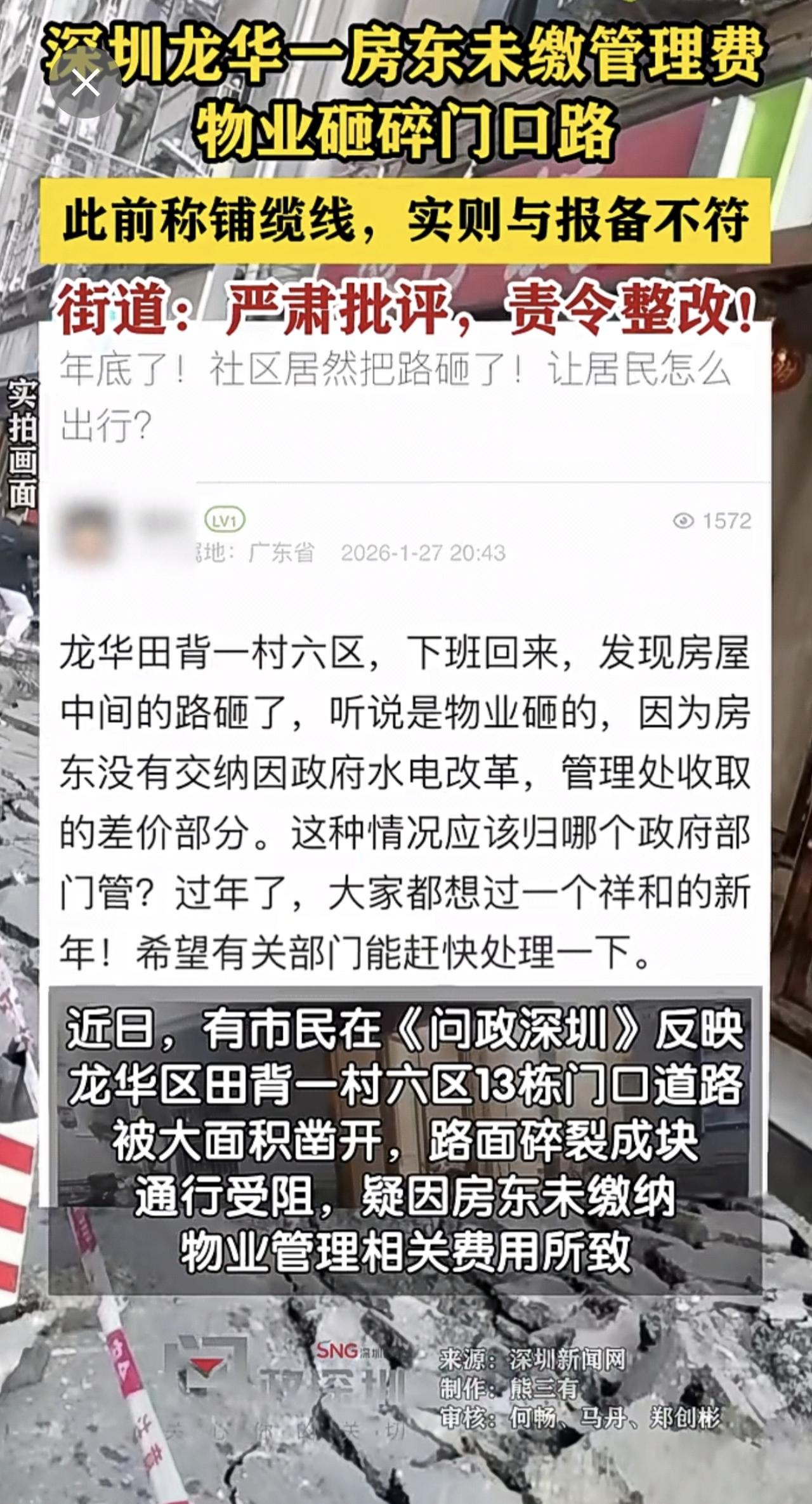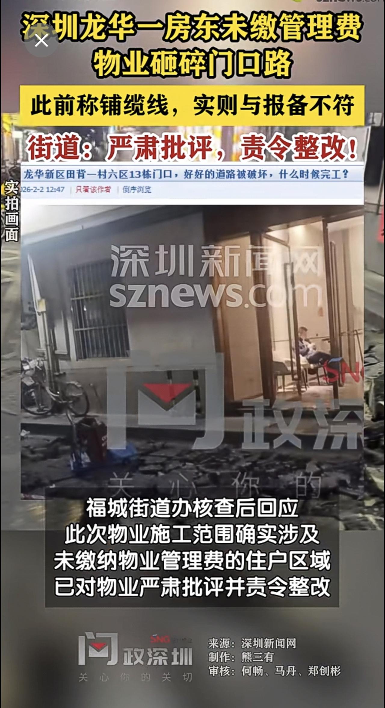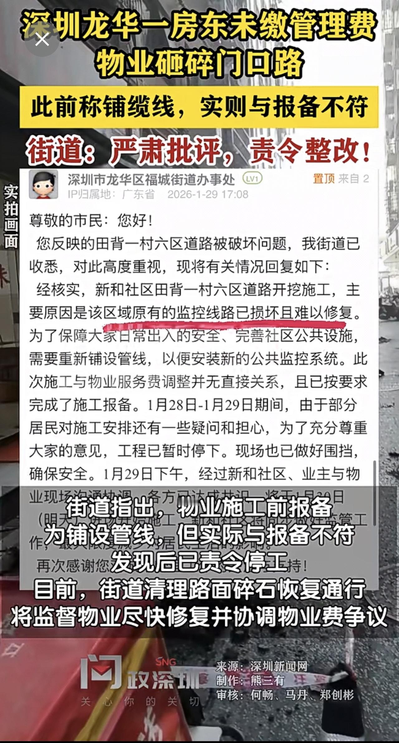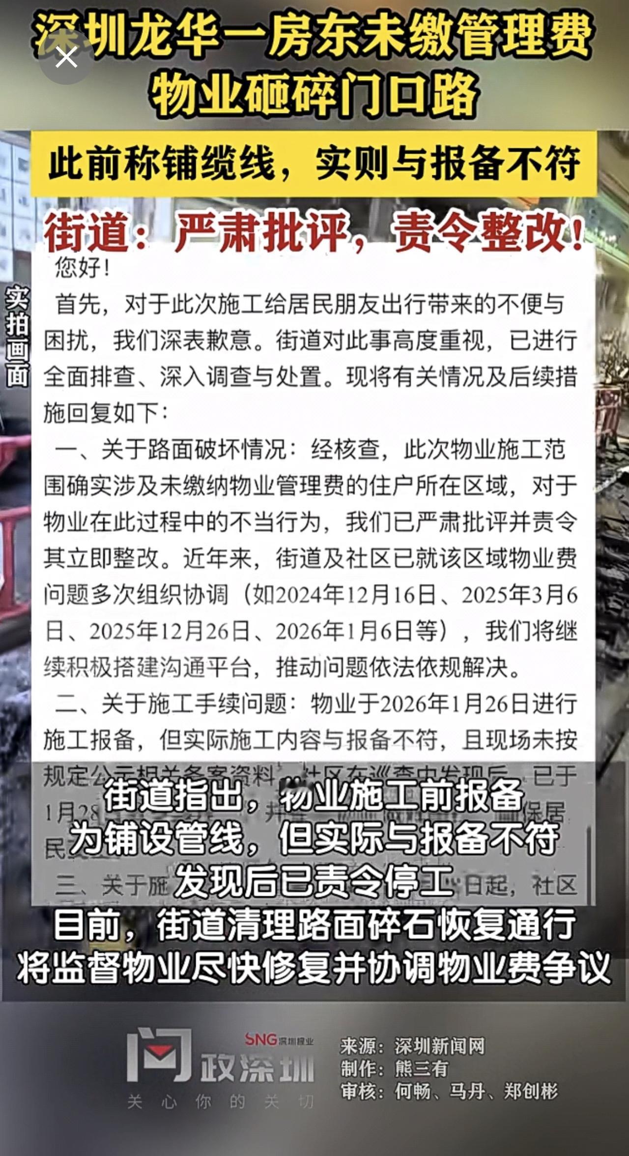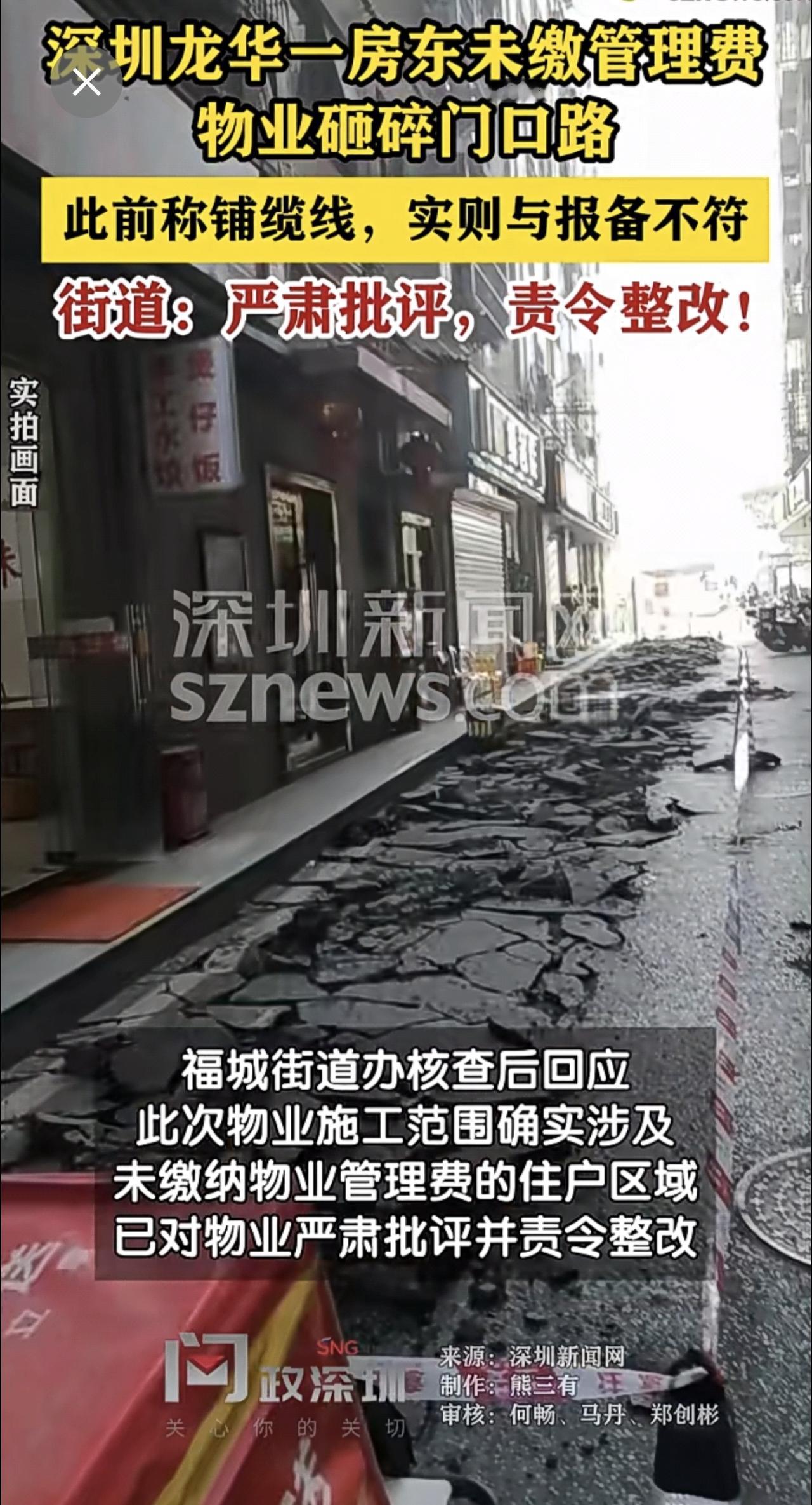 【房东未缴管理费物业砸碎门前路】街道回应。(深圳新闻网)制作:熊三有 审核:何畅、马丹、郑创彬