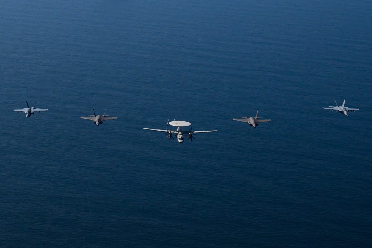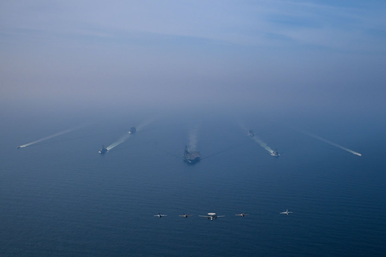 今日在阿拉伯海海域,亚伯拉罕·林肯号航母战斗群携两艘军用补给舰和两艘美国海岸警卫队快艇同行,此时航母第9舰载机联队的战机正在上空飞行。