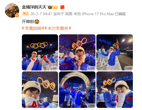 【金博洋带你第一视角看开幕式】冬奥会开幕式第一视角 2月7日,2026年米兰冬奥会开幕式举行,中国花样滑冰男子单人滑选手发博分享开幕式现场照片,以第一视角带网友感受开幕式氛围。