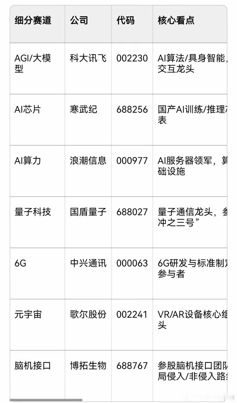 2026未来产业A股标的分级(高/中/低确定)✅高确定(业绩强支撑):科大讯飞、浪潮信息、宁德时代、隆基绿能、德赛西威、药明康德👉AI应用/储能/光伏/高阶智驾/CXO,落地快、盈利稳✅中确定(2026业绩拐点):寒武纪、绿的谐波、亿航智能、凯赛生物、天岳先进👉AI芯片/人形机器人/低空经济/合成生物,量产推进、弹性足✅低确定(主题为主):国盾量子、西部超导、亿华通、航天电子、博拓生物👉量子/核聚变/氢能/脑机接口,技术攻坚、政策待落地