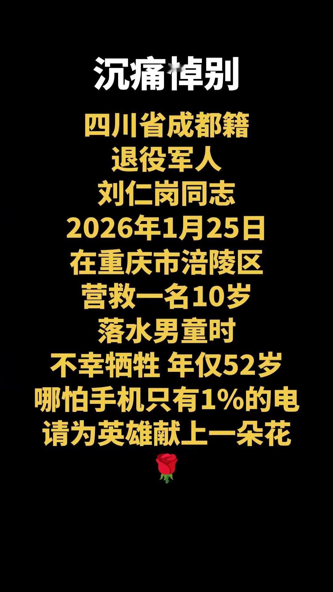 痛悼英雄!52岁退伍军人救落水童牺牲,最后一刻仍托举孩子,原定近期领证 长江边那奋力向上的托举,成了永恒的英雄姿态!52岁退伍军人刘仁岗,为救落水男童纵身跃入冰冷江水,直至生命最后一刻都未松开孩子,而他原本再过不久,就要和未婚妻领证结婚,这一幕看哭无数人! 1月25日的重庆涪陵,10岁男童失足坠江,正在江边散步的刘仁岗听到呼救,不顾未婚妻“先脱衣服”的提醒,仅扒掉外套就冲进江中。他一边安抚孩子“我拉到你了,别乱动”,一边拼力往岸边游,可冰冷江水、浸水的厚重衣物,很快耗尽了他的体力。近在咫尺的救生圈他无力触碰,却始终用双手把孩子向上托举,直至沉入江中。 这位四川退伍老兵,曾在都江堰救过落水儿童,平日里就热心助人,本盼着和爱人开启幸福生活,却在生死关头选择挺身而出。战友苏明波后续救起孩子,可孩子仍不幸离世,而刘仁岗的遗体,直到当晚才被打捞上岸。他用生命践行了军人的誓言,退伍从未褪色,危难时永远冲锋在前。 如今相关部门正为他申报见义勇为、评定烈士,他的壮举被无数人铭记。这世间从没有天生的英雄,只是有人在危难时选择义无反顾。刘仁岗用生命托举起生的希望,用坚守诠释了军人担当,他的名字,值得我们永远铭记!英雄一路走好,这份人间大爱,永远照亮山河!退伍军救人