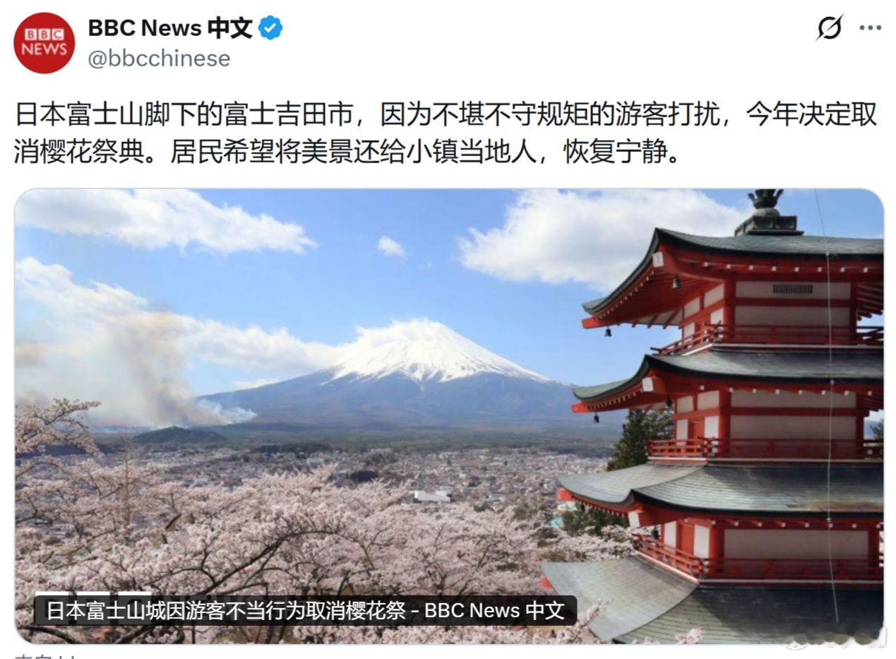 BBC:日本富士山樱花节停办,原因是“当地居民的平静生活受到威胁”。富士吉田市政府说,外国游客的涌入导致当地交通长期拥堵垃圾四散,烟头随处可见,甚至有市民反映一些游客还“未经许可擅开民宅大门借用厕所”、擅闯私人土地、乱丢垃圾,甚至“在私人庭院便溺,当居民出声制止时还大吵大闹”。不光是中国游客少了,但凡这些事有极个别是中国人做的,这锅也肯定会甩到“中国人”身上!日本富士山樱花节停办