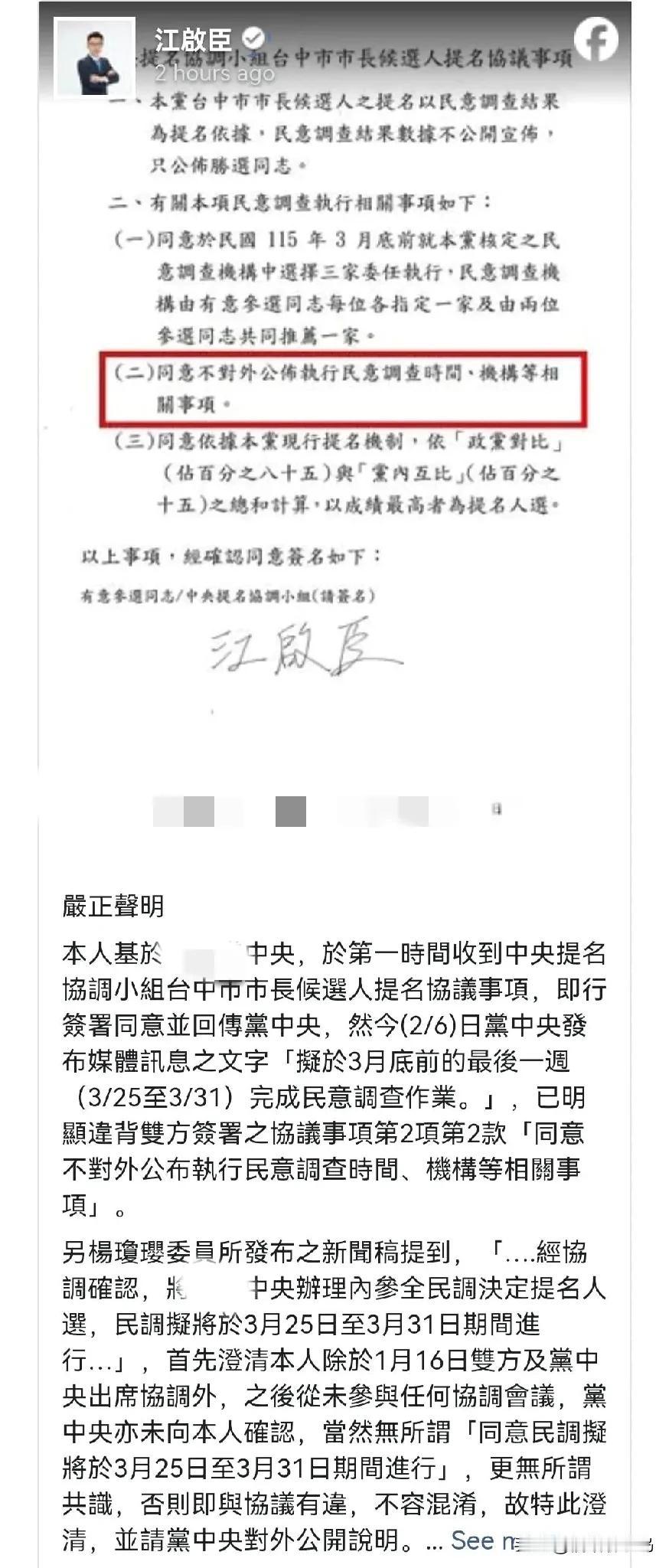 台中蓝营市长之争再起波澜 江启臣不满提名机制 外界传姐弟失和 杨琼璎:我们互动良好 2026年2月7日,国民党台中市长提名之争持续延烧。面对与“立院副院长”江启臣之间的协调分歧,寻求提名的“立委”杨琼璎今日(7日)公开回应,表示两人互动良好,强调党内团结的重要性。 近日,关于国民党台中市长提名机制的协调过程出现不同说法。杨琼璎此前表示,经协调已与江启臣达成共识,由蓝营中央办理“内参全民调”决定提名人选,民调拟于3月25日至31日期间进行。 然而,江启臣方面随后发布声明驳斥,指出蓝营中央发布的消息违背了双方签署协议中“不对外公布民调时间与机构”的条款,并否认昨日(6日)有新的协调进展。 尽管外界传出两人“提名失和”,杨琼璎今日在大坑步道发送春联时强调,她始终尊重蓝营中央的提名机制,也乐见蓝营中央发布讯息以安定基层人心。 她坦言,自己与江启臣在跑活动时遇到仍会寒暄交谈,互动很好。杨琼璎重申,无论最后由谁出线,国民党的团结都比个人更重要,呼吁大家团结一致,共同为台中努力。