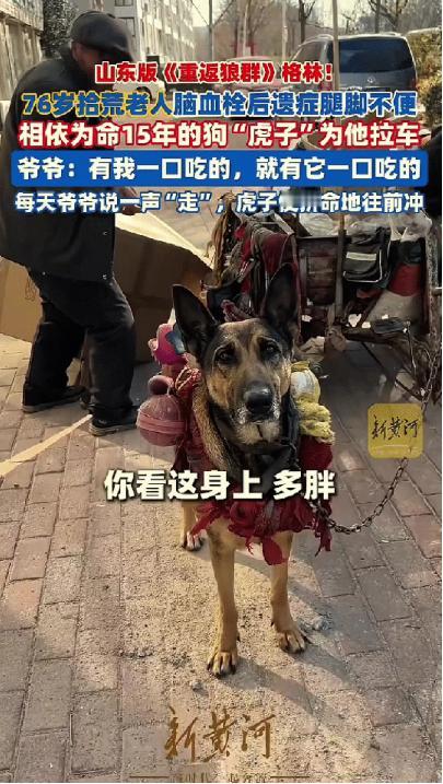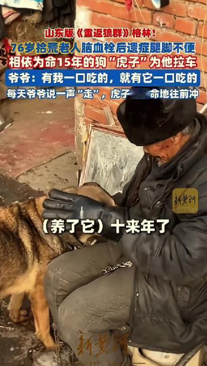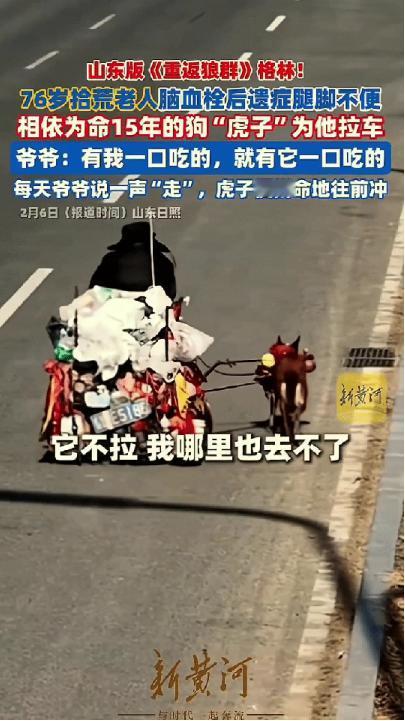 “破防了!”近日,山东日照,76岁拾荒老人脑血栓后遗症腿脚不便,相依为命15年的狗“虎子”为他拉车,被网友暖心称为:山东版《重返狼群》格林!一人一狗之间的故事让网友破防! 山东日照的城郊小院里,每到黄昏总能看到一幅温情的画面。 七十六岁的拾荒老人坐在矮凳上,手里轻轻抚摸着身边的土狗,二三十只流浪猫围着他们的脚边打转,有的蹭着老人的裤腿,有的卧在土狗身旁。 这只土狗名叫虎子,今年已经十六岁高龄,换算成人的年龄,早已是垂暮之年。 没人能想到,这只如今身形壮实、眼神温顺的土狗,十五年前差点死在寒冬的垃圾堆里。 那年冬天老人像往常一样出门拾荒,在一堆破旧杂物里,发现了这只只有一个月大的小奶狗。 小奶狗冻得瑟瑟发抖,连叫出声的力气都没有,眼看就要撑不下去。 老人本身日子就过得清贫,靠拾荒勉强糊口,可看着这只奄奄一息的小生命,他还是狠不下心转身离开。 他把小奶狗裹在怀里,用自己的体温温暖着这个脆弱的小生命,然后揣着它回了家。 他给这只小奶狗取名虎子,盼着它能像小虎一样结实,好好活下去。 日子一天天过去,虎子从一只弱不禁风的小奶狗,长成了一只健壮的土狗。 它没有名贵的品种,却格外通人性,把老人的一举一动都刻进了骨子里,不管老人走到哪里,它都寸步不离地跟着。 可不幸的是,随着年纪增长,老人的身体越来越差,不仅患上了关节炎,还得了脑血栓,治愈后留下了严重的后遗症,腿脚变得十分不便,走路都有些蹒跚,更别说出门拾荒了。 拾荒是老人唯一的收入来源,为了能继续活下去,哪怕腿脚不便,他也必须出门。 有一次,老人看着自己三轮自行车,随口说了一句,要是能有人帮着拉车就好了,说完也没往心里去。 可让他没想到的是,一旁的虎子像是听懂了他的话,默默地走过去,叼起车上的简易布绳拉带,使劲往前拽了拽。 从那以后,虎子就成了老人的专属“车夫”,每天陪着老人出门拾荒。 老人的拾荒推车焊着铁框,装起纸板、塑料瓶就变得沉甸甸的,虎子套着那块磨得发亮的布绳拉带,低着头、弓着背,后背的肌肉绷得紧紧的,拼命地往前拽。 每天天不亮,两人就准时出门,沿着大街小巷拾荒,一天要跑三四十公里的路,直到天黑透了,才拖着疲惫的身躯往家走。 虎子不仅拉车卖力,还格外聪明听话,跟着老人出门这么多年,从来不会闯红灯,也不会到处乱跑。 只要老人轻轻喊一声“走”,它就立刻打起精神,拉着车往前冲。 要是老人停下来拾荒,它就静静地守在老人身旁,低着头,眼神警惕地观察着周围,生怕有陌生人靠近伤害到老人。 这些年,老人的日子过得紧巴到了骨子里,一斤纸板卖几毛钱,一斤塑料瓶也换不来一块钱,每天卖废品的收入,刚够勉强糊口。 可即便如此,老人也从来不会亏着虎子,虎子也被养得浑身有肉,十分健康,一眼就能看出,老人平日里对它有多用心。 后来,老人在拾荒路上,又陆续带回了二三十只流浪猫,有的是被人丢在垃圾桶旁的奶猫,有的是被车撞断腿的成年猫,还有的是跟着母猫流浪的小崽。 老人见着了就挪不开脚,哪怕自己少吃一个馒头,也要把这些可怜的小生命带回小院,给它们一个遮风挡雨的家。 虎子也从不和小猫们争食,每次老人把食物摆出来,它都蹲在一旁静静地看着,等小猫们吃够了,才会慢慢走过去,舔食剩下的食物。 要是有陌生的野狗、野猫靠近小院,抢小猫们的食物,虎子就会立刻竖起耳朵,冲上去低吼,把外来者赶得远远的,默默守护着这些和它一起陪伴老人的小生命。 如今,两者都渐渐年迈,老人的腿脚越来越不便,虎子的步伐也不再矫健,拉车时越来越吃力,喘得也越来越厉害。 可即便如此,只要老人需要,只要听到老人的呼唤,虎子依旧会立刻起身,叼起布绳拉带,拼尽全力陪着老人出门拾荒。 老人常说,自从自己腿脚不便后,要是没有虎子拉车,他哪里都去不了,更别说拾荒糊口了。 他也对虎子许下承诺,这辈子,只要有他一口吃的,就一定有虎子一口吃的。 十五年的相伴,没有轰轰烈烈的举动,没有惊天动地的故事,只有日复一日的陪伴和守护。 老人用一份善意,给了虎子生的希望,虎子用一生的忠诚和陪伴,回报着老人的恩情,一人一狗,相依为命,在清贫的日子里,互相帮扶,彼此温暖。