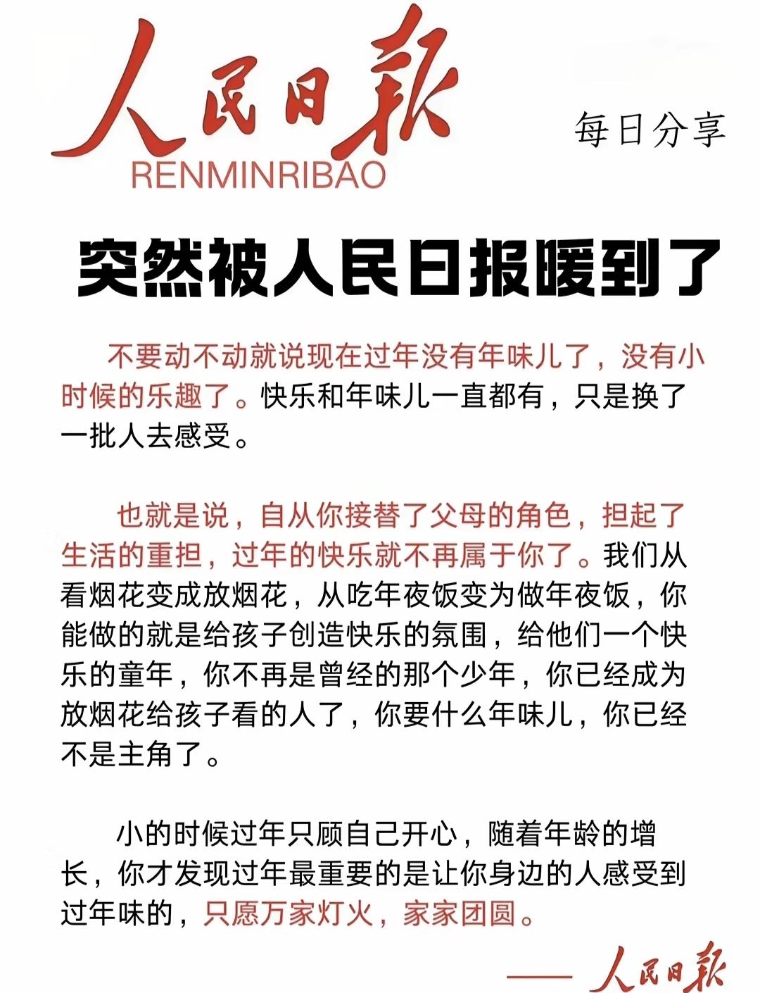 突然被人民日报这段话共情到了 不是现在的年味儿变淡了, 而是换了一批人去感受、期待过年。 以前期待过年的那一批人,担起生活的重担,接替父母的角色,生活的压力在背上,已经让我们不再期待过年~过年落差感
