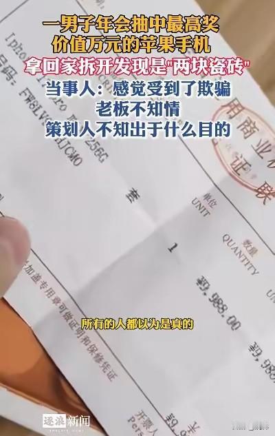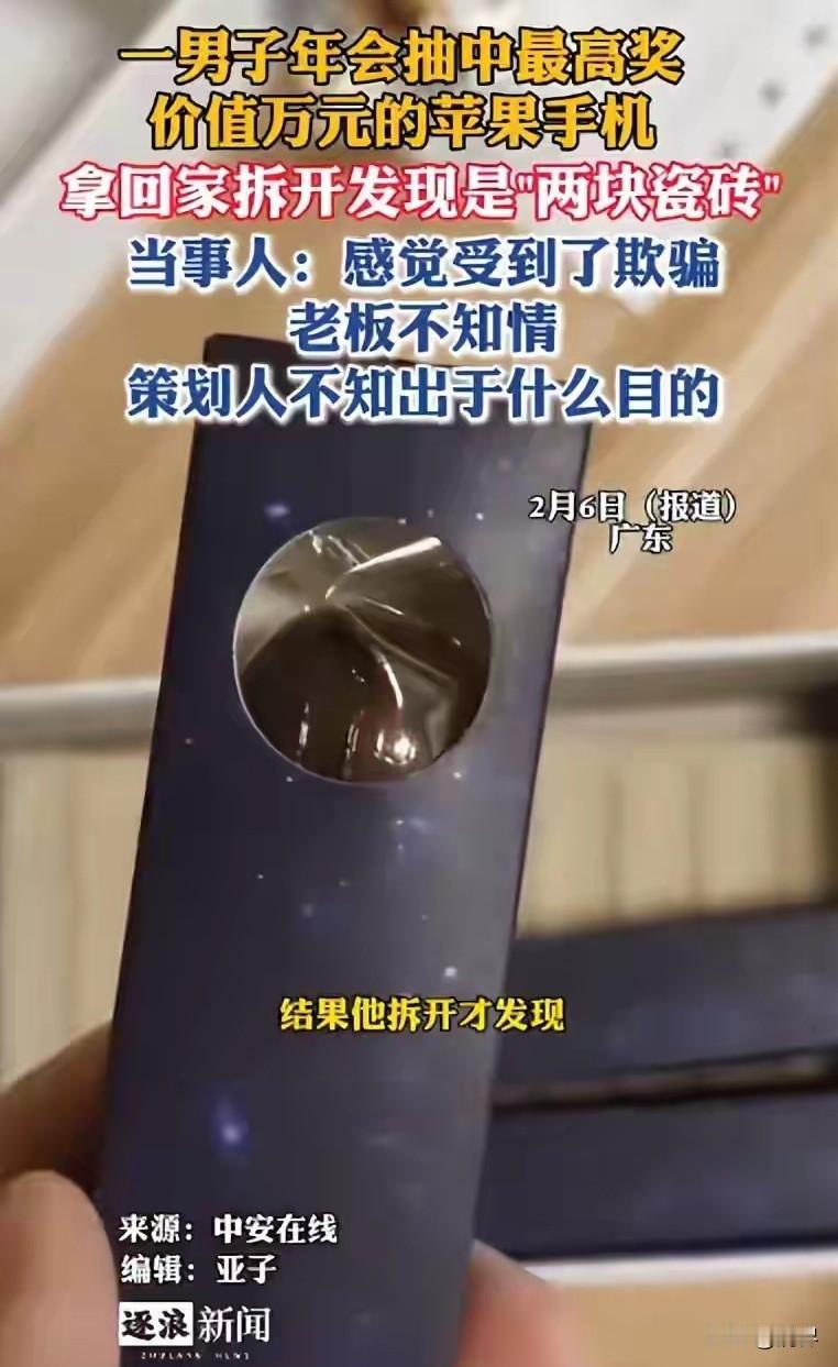 年会上抽中万元苹果手机,回家一打开居然是两块板砖!最后调查竟是策划人私自调包,其解释是“活跃气氛”,如果这种品行都还能保住工作,那这公司肯定也不怎么样? 想不通的是,这位策划人还是个科室主任,大大小小也是个官,收入待遇在广东肯定也不会低,竟然为了一部手机做出这种愚蠢行为。 况且他就不担心,中奖者当场打开手机包装吗?这样不就出丑出得更大!即使中奖者回家才发现被掉包,现在也是全司上下都知道了他的丑闻,那以后不得被人一直指指点点?还怎么在单位立足?