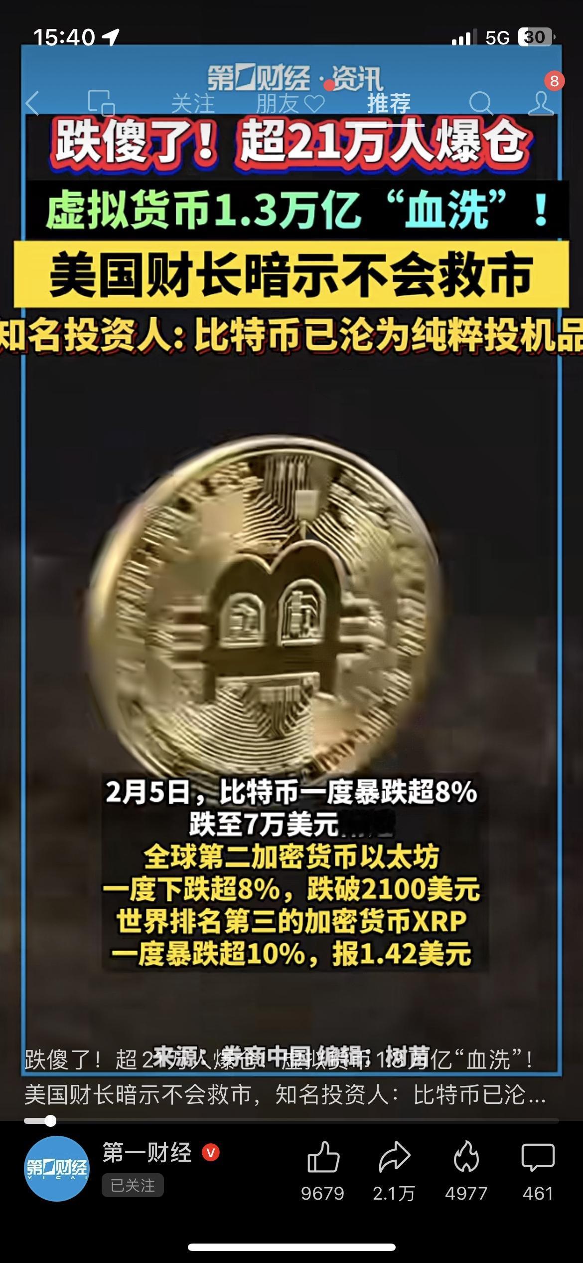 虚拟货币血洗!1.3万亿蒸发,21万人爆仓 比特币暴跌超8%,美国财长暗示不会救市,知名投资人直言“比特币是纯粹投机品”。 普通人别碰虚拟币,本金亏光都没处说理! 你身边有人炒币亏惨了吗? 虚拟货币 财经热点 比特币 市场有风险,投资需谨慎