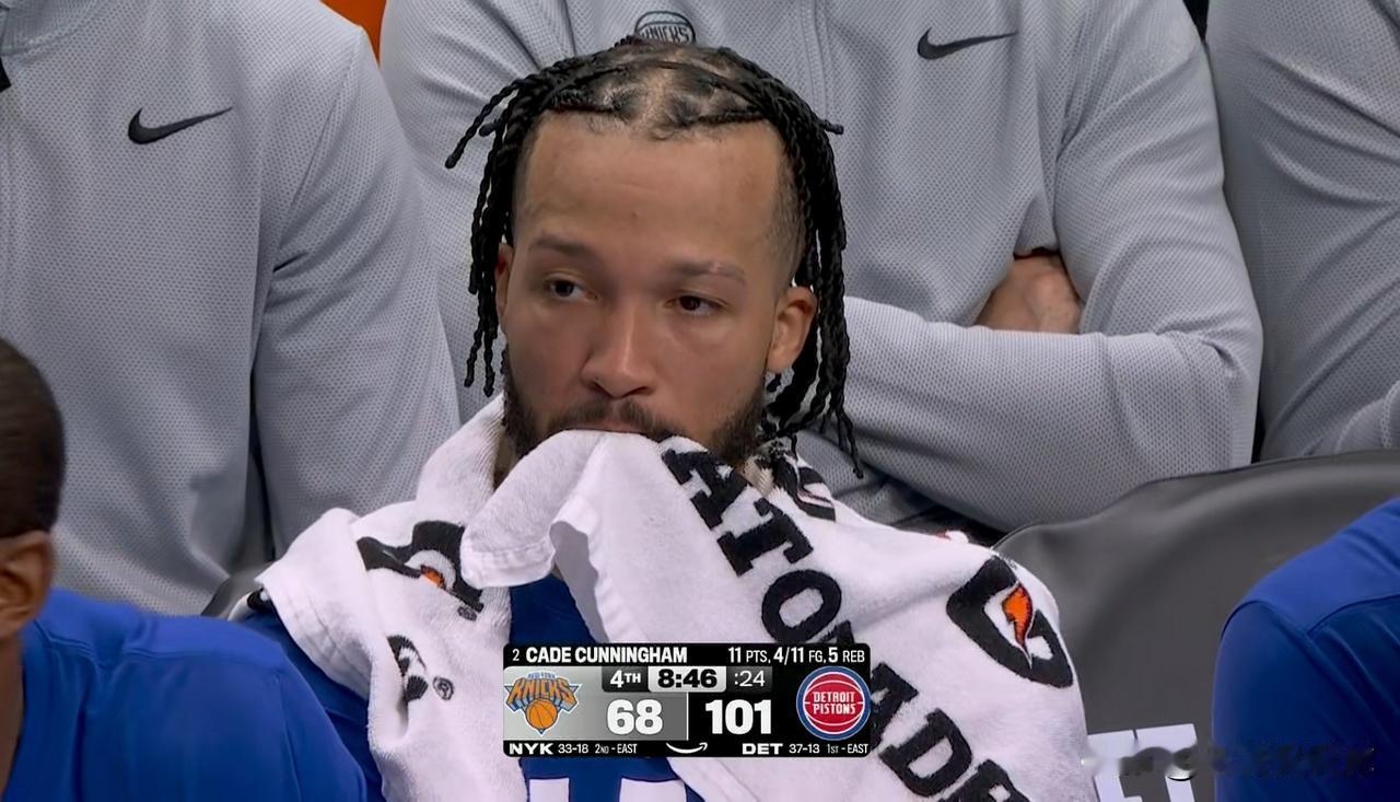 在今天尼克斯客场挑战活塞的比赛中,发生了让人无比心碎的一幕。当时比赛进行到了第四节的8分46秒,尼克斯以68:101落后于对手,一场血淋淋的惨败已经板上钉钉了。这个时候转播镜头给到了尼克斯的替补席,只见超级巨星布伦森用嘴叼着毛巾看起来极度的沮丧,他目光呆滞、神情落寞的坐在场下,整个人看起来特别的失望、无奈和自责,让人看着无比的心碎。 值得一提的是,本场比赛布伦森在进攻端大失水准,他在首发出战的31分钟里投篮20中4,其中三分球8中0非常低效的得到12分。