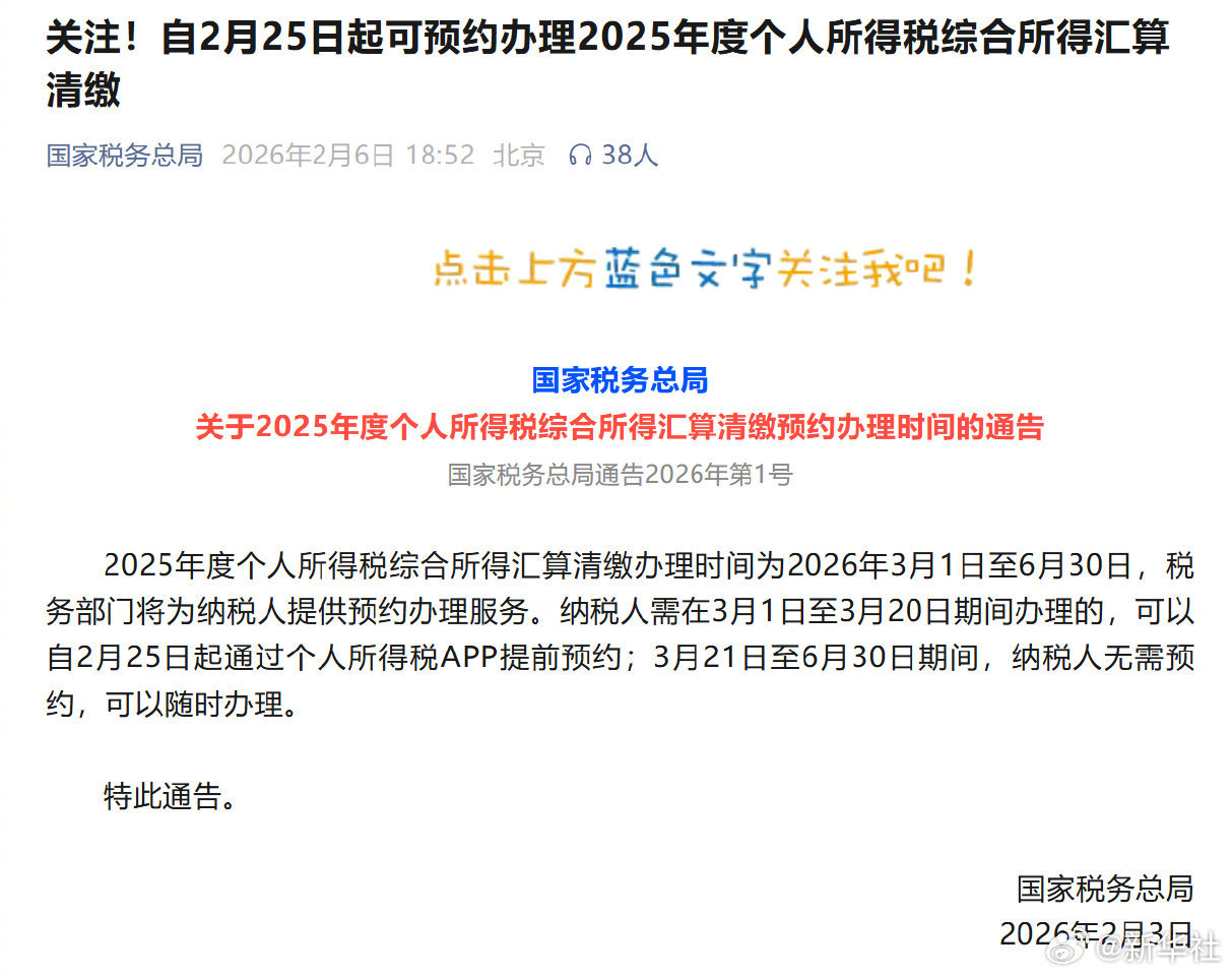 #个税年度汇算#【#2025年个税退补税3月起办理#】国家税务总局近日发布《关于2025年度个人所得税综合所得汇算清缴预约办理时间的通告》:2025年度个人所得税综合所得汇算清缴办理时间为2026年3月1日至6月30日,税务部门将为纳税人提供预约办理服务纳税人需在3月1日至3月20日期间办理的,可以自2月25日起通过个人所得税App提前预约3月21日至6月30日期间,纳税人无需预约,可以随时办理 (国家税务总局)
