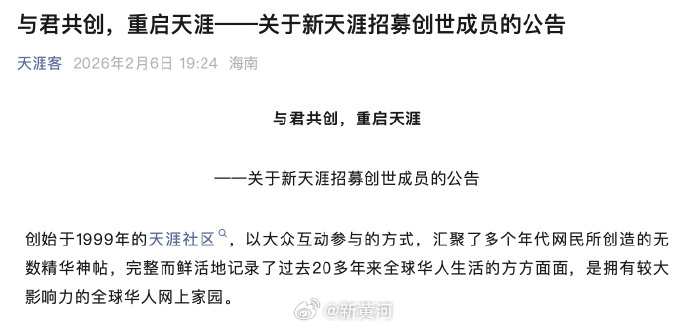 【关停近3年,#天涯社区6月重启#】#天涯社区创世会员1999元# 2月6日晚,沉寂已久的天涯社区通过官方公众号“天涯客”发布公告《与君共创,重启天涯》,宣布计划于2026年6月1日恢复访问。这个承载早期中文互联网记忆的论坛再次进入公众视野。不过,截至发稿,公告发布约15小时,阅读量仅1300多次。