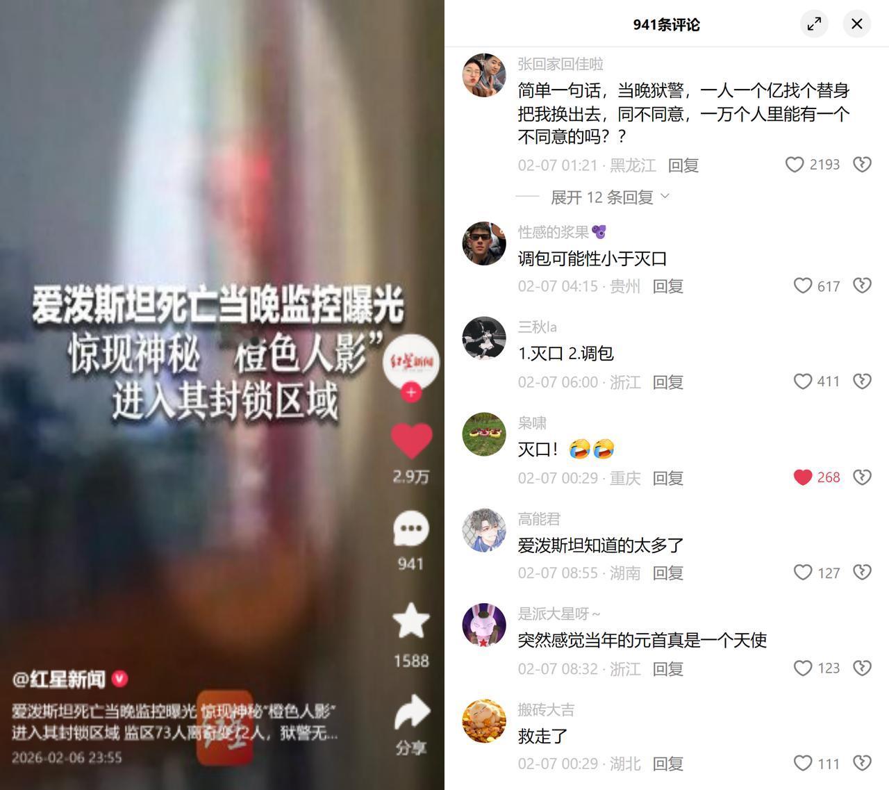 爱泼斯坦案监控曝光,橙色人影成谜 这段刚流出的监控,直接把官方的自杀论打了脸。画面里有个穿橙色囚服的人影,径直进了爱泼斯坦的封锁区,当晚监区人数还从73变成72,负责看守的人对此完全没法解释。大家瞬间沸腾了,灭口、调包的说法满天飞。 这事儿看着荒唐,仔细想想倒也不意外。当一个人掌握了足以触碰他人核心利益的秘密,他的命运早就不在自己手里了。所谓的监狱监控、人数台账,在绝对的资源和权力面前,可能只是用来走流程的摆设,甚至是故意留下的破绽,给公众一个模棱两可的交代。 毕竟橙色囚服的身份已经实锤是囚犯,这意味着有人能随意突破监区的管理规则,连最基本的人数核对都能跳过。这种规则的失效,很难说是某个人的疏忽,往往是某些灰色潜规则在暗处运作的结果。 至于真相到底是什么?或许永远不会有答案。但大家心里都清楚,有些桌子底下的交易,从来都见不得光。