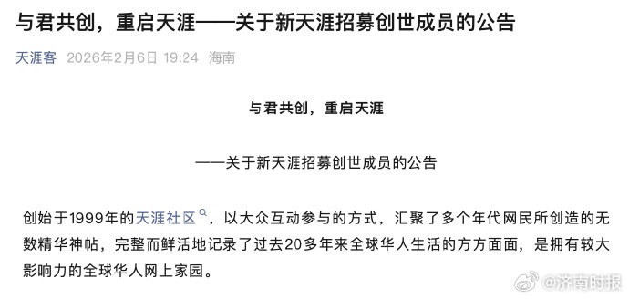 【关停近3年,#天涯社区6月重启#】#天涯社区创世会员1999元# 2月6日晚,沉寂已久的天涯社区通过官方公众号“天涯客”发布公告《与君共创,重启天涯》,宣布计划于2026年6月1日恢复访问。这个承载早期中文互联网记忆的论坛再次进入公众视野。不过,截至发稿,公告发布约15小时,阅读量仅1300多次。