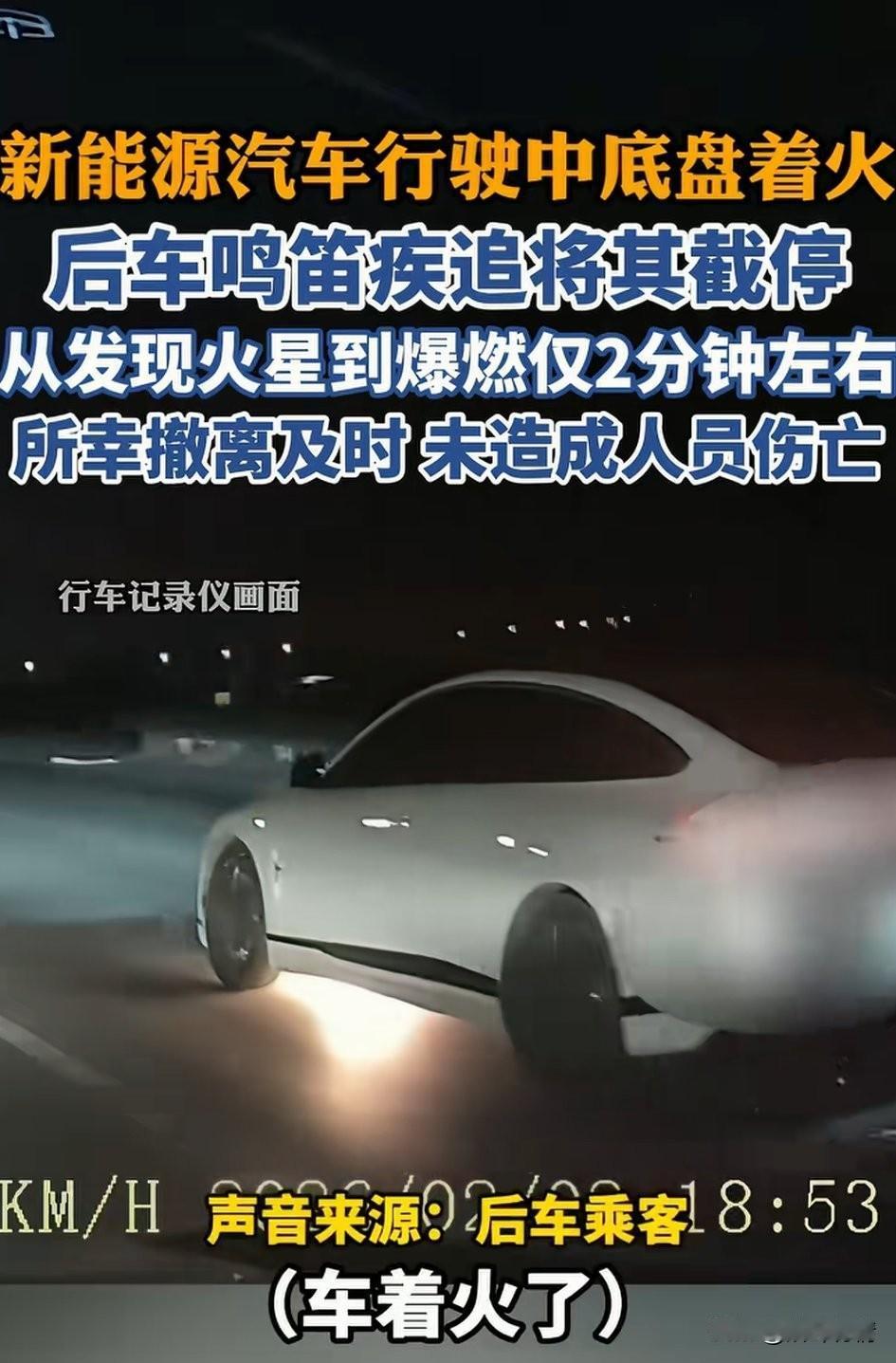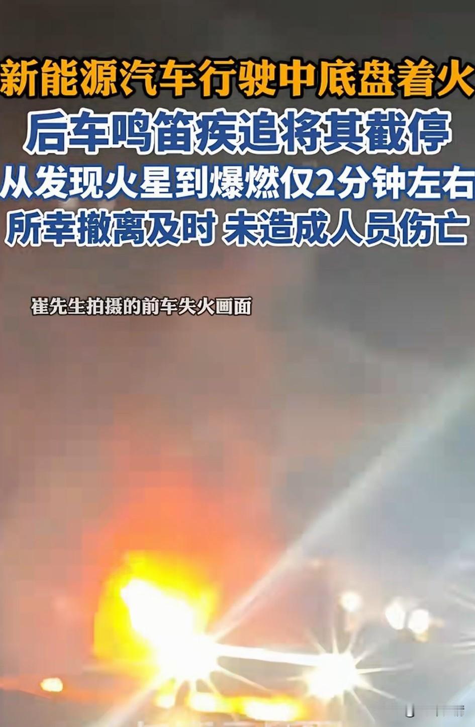 新能源车辆行驶途中底盘突然冒火,但是车上的司机毫无察觉,还在向前开车! 后车司机崔先生看到了这一幕,于是赶紧加速冲了上去,他的母亲摇开车窗大喊,你的车着火了,声音都喊哑了! 崔先生赶紧加速超越后将其截停,着火的新能源车辆上有两个人,他们这才惊觉自己的车着了! 停车后赶紧撤离,从追赶到捷停下车用了2分钟,随后车辆迅速爆燃,还没有,等消防员赶到,车辆已经被大火吞噬! 洛阳的崔先生真是个好心人,要不是他提醒及时,这新能源车辆恐怕就要出人命了! 虽说新能源车辆比较省油,但是最近出的问题还真的很多,买车的朋友可要自行斟酌了,看你是想省油还是想省命? 大家对于洛阳这起新能源车辆着火怎么看? 洛阳 新能源自燃事故 纯电车起火 新能源车事故