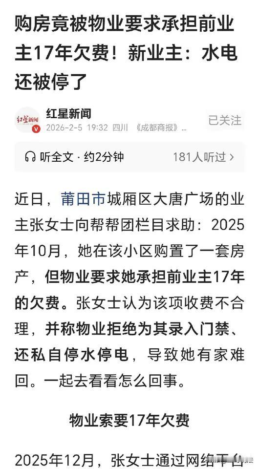“太离谱了!”福建莆田一女子拍套房,物业断水断电竟要她缴前业主欠款,令人震惊的真相揭晓! 近日,一则关于福建莆田一女子张女士的事件引发了众多网友的关注和热议。事情的起因简单,却让人愤怒不已:张女士刚刚买下了一套房子,入住后却被物业公司“断水断电”,理由竟然是要她缴清前业主欠下的物业费!更令人匪夷所思的是,物业声称自己没有责任,所有欠款都应由前业主承担,而自己只是“被委托”追缴。 事情的经过令人震惊。张女士在购买房产后,正常入住多年,生活安稳。然而,某天物业突然上门,要求她缴清前业主所欠的物业费达六万元!面对突如其来的“巨额账单”,张女士一头雾水。她拿出法院拍卖确认书,试图证明自己只需承担前业主的公摊水电费,物业费应由物业公司向原业主追缴。可是,物业公司不仅拒绝承认,还以断水断电、门禁不给录入、锁住电表箱等方式,阻止她正常生活。 “你们这是在欺负人!”张女士愤怒地质问。她表示,自己已经在这套房子住了17年,从未遇到过类似的问题。为什么突然要缴清前任业主的所有欠款?这是不是在“趁火打劫”?她的心情可以用“愤怒、无助、愤慨”来形容。 这起事件背后,隐藏着许多令人深思的法律与管理问题。首先,物业费的责任归属问题。一般来说,物业费由现有业主承担,前业主的欠款应由其本人负责。法院拍卖确认书如果没有明确转移物业费责任,现业主通常不应承担这些费用。其次,物业公司采取断水断电等极端措施,明显越界,可能涉嫌违法。物业应依法维护公共设施,但不能以威胁业主生活为手段。 令人震惊的是,事情的“转折点”——最终,相关部门介入调解,物业被要求恢复供水供电,责令其合理处理欠款问题。张女士也得以澄清,避免承担不应有的责任。事件的真相逐渐浮出水面,也让人反思:在房产交易中,权益的界限在哪里?物业管理的责任应如何界定?业主的合法权益又该如何保障? 这起“离谱”的事件告诉我们,物业公司应依法依规行事,业主权益必须得到尊重和保护。遇到类似问题,业主应保存证据,寻求法律帮助,用合法的方式维护自身权益。希望未来的物业管理能更加规范,让业主们不再为“莫须有”的费用烦恼,不再被“断水断电”的威胁所困扰。 这件事情虽然暂告一段落,但留给我们的思考却远未结束。合理合法的物业管理,公正透明的责任划分,才是维护和谐社区的根本所在。我们期待,类似的“离谱”事件不再重演,让每一位业主都能安居乐业,无忧无虑。