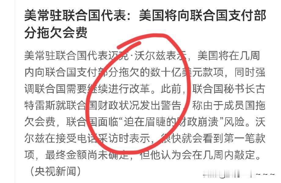 最新消息! 美国常驻联合国代表沃尔兹表示:美国将向联合国支付部分拖欠会费。 这下沃尔兹脸上是有光了,要不,在联合国发个言底气都没有,要知道美国欠联合国的费用可不是一点点,据媒体报道,已经超过了30亿美元,是最大的欠费国家,再不支付联合国今年上半年经费都没有了,难道要让联合国也“停摆”吗? 所以说,此次美国决定支付部分费用,美国是履行义务,也是给自己挽回一点面子,否则,根据联合国宪章第19条,再不支付将可能会失去在联合国大会的投票权,如此以来那不是太丢人了吗?