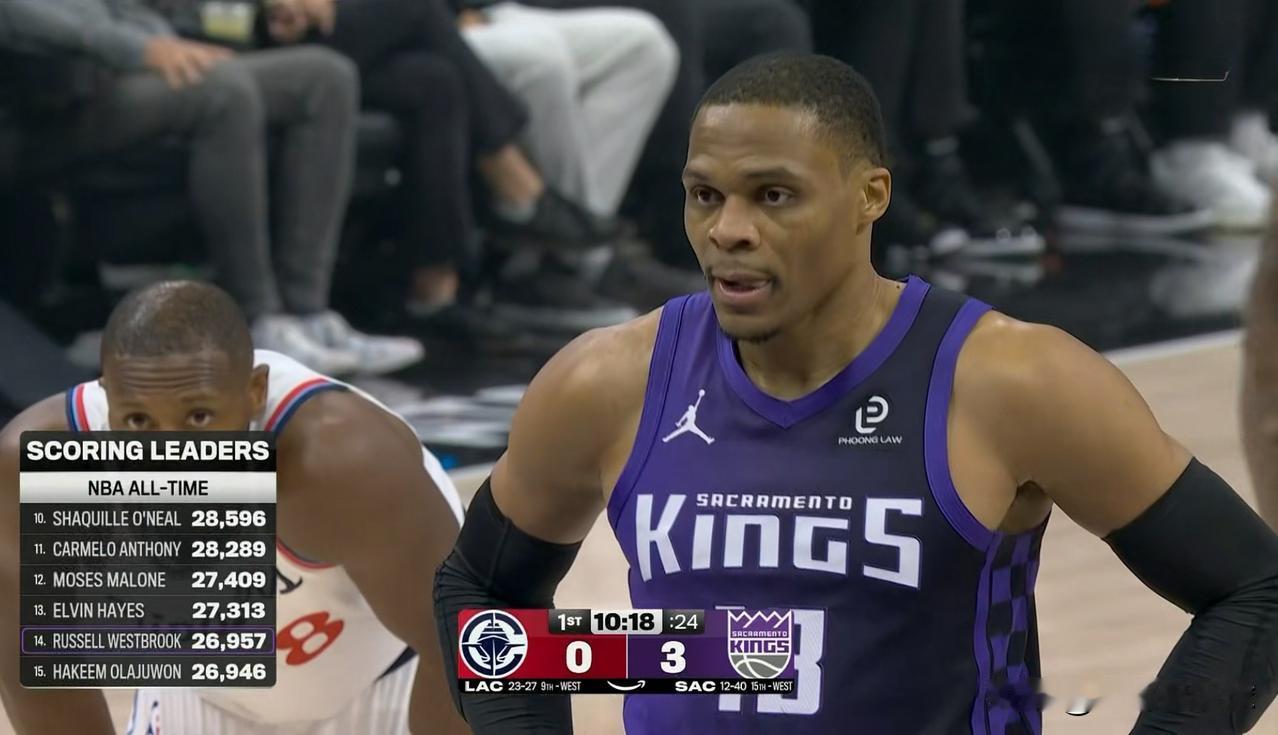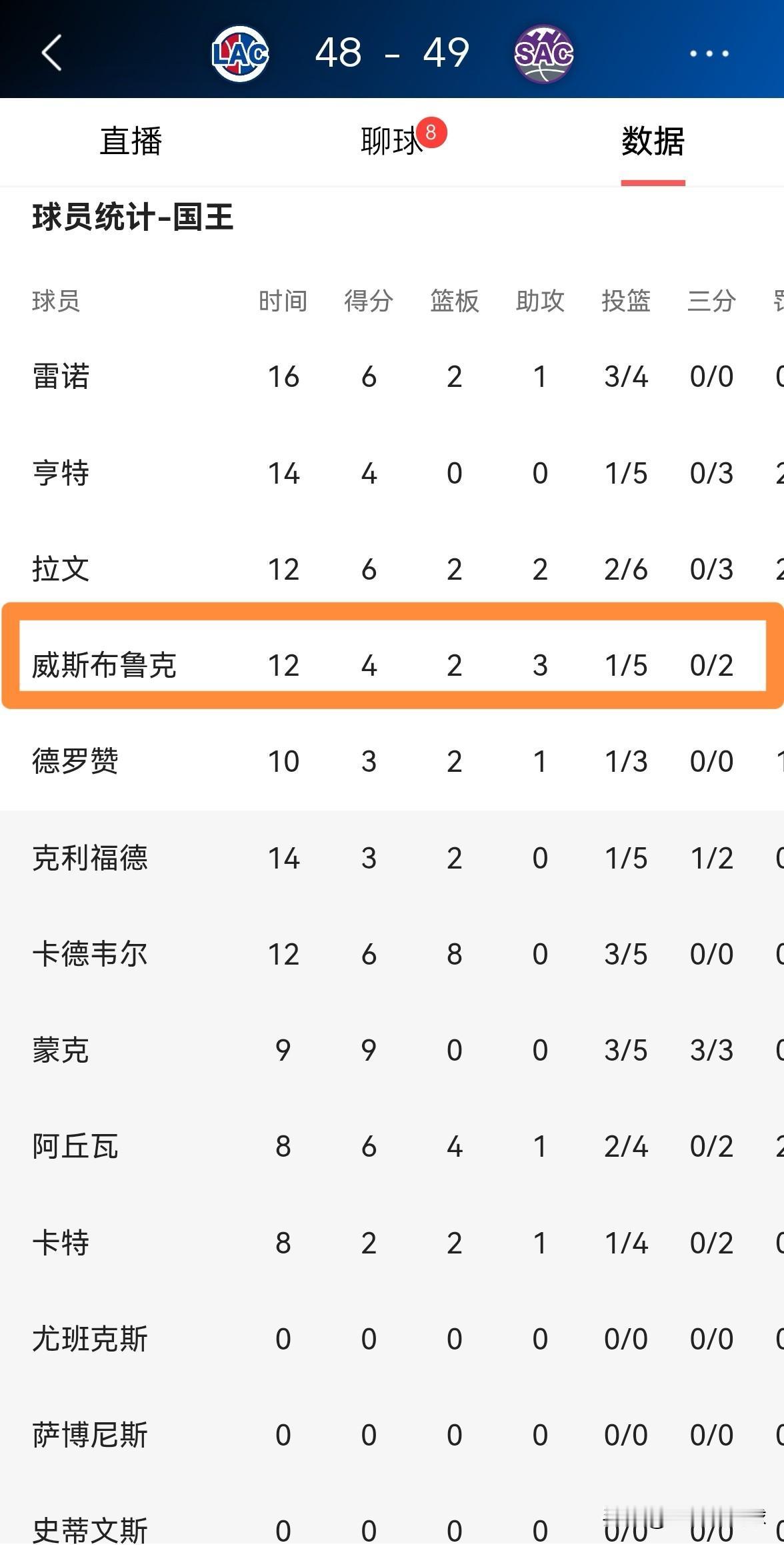 国王老将威斯布鲁克真是太善解人意了!在今天国王主场迎战快船的比赛中,目前双方半场战罢,国王以49:48领先对手。在前两节比赛中,威少深知老东家快船目前遭遇了缺兵少将的困难,因此威少并没有痛下杀手,他在首发出战的12分钟里,投篮5中1,其中三分球2中0、罚球3中2非常低效的得到4分,还有1次失误和2次犯规,他的场上正负值为-2。