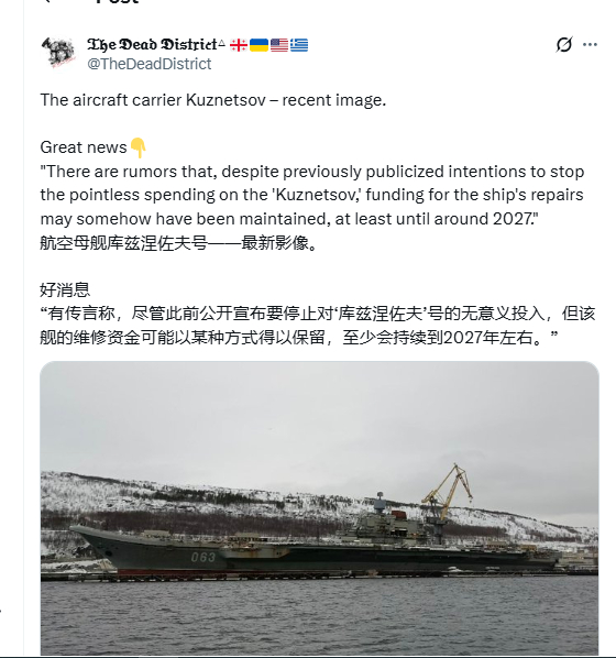 值得关注的是,关于库兹涅佐夫号的命运,仍有一丝不确定的传言。有消息称,尽管俄罗斯此前已公开宣布要停止在该舰上的“巨额开支”,核心方案集中在封存、拆解报废,或是寻找海外买家(印度再次购买的可能性很低),但是截止目前俄罗斯并没有给出明确的说法,其依然是“死”在专家和船厂的建议中。根据目前的已知信息其相关的维修资金可能以某种方式被保留,至少会持续到2027年左右。不过,这一传言尚未得到官方证实。