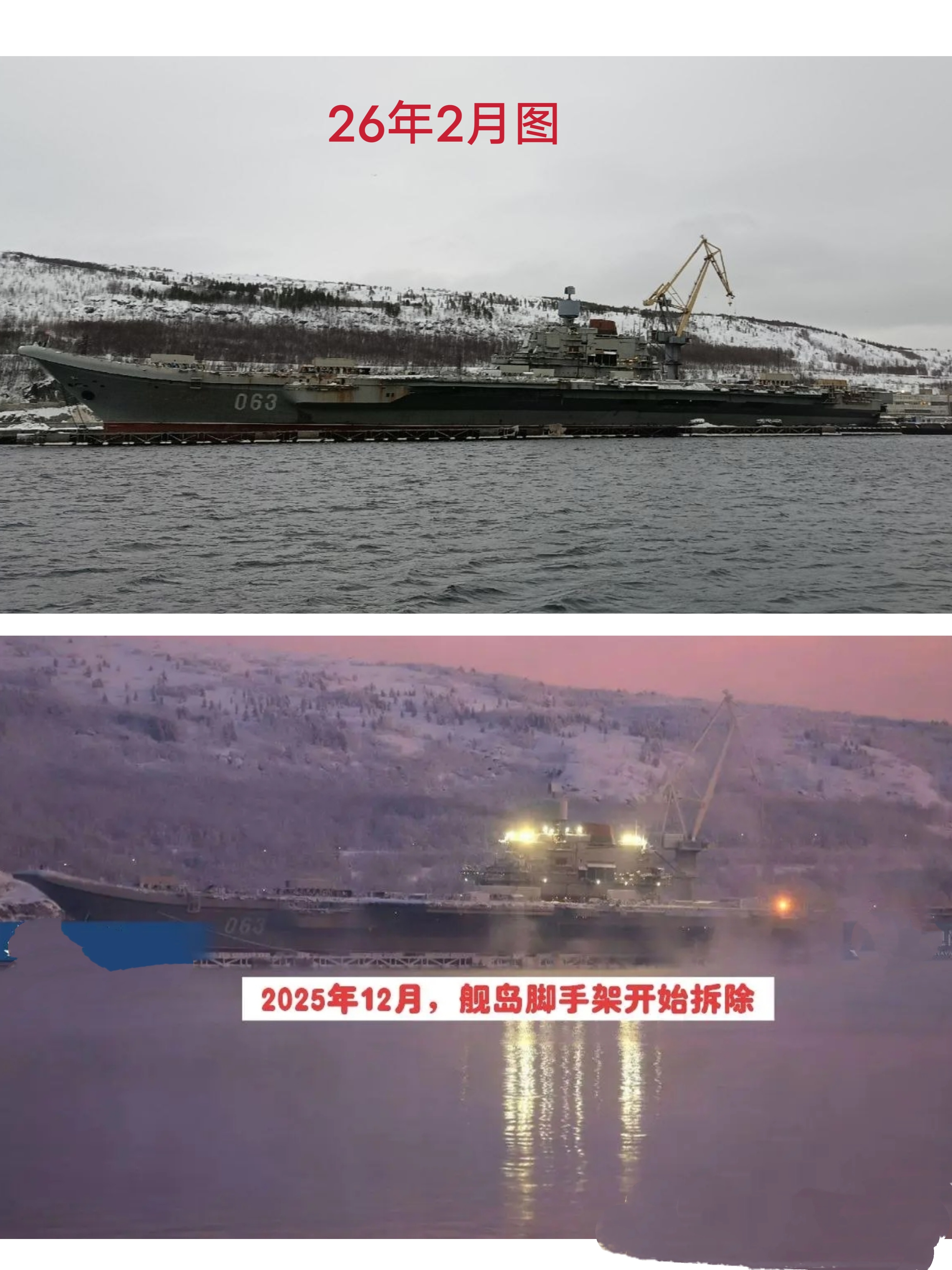 近日网友分享了在俄罗斯摩尔曼斯克附近的第35修船厂码头的“库兹涅佐夫”号航母的近况,这张照片可能拍摄于今年2月4日。从照片判断,维修进展非常缓慢或已完全暂停,甲板上布满了工程设备和杂物,舰岛和船体表面的修补痕迹非常明显,完全没有进入航行测试阶段的迹象。结合目前的局势,这艘航母的维修进度确实处于停滞甚至放弃的边缘,未出现明显的维修迹象。