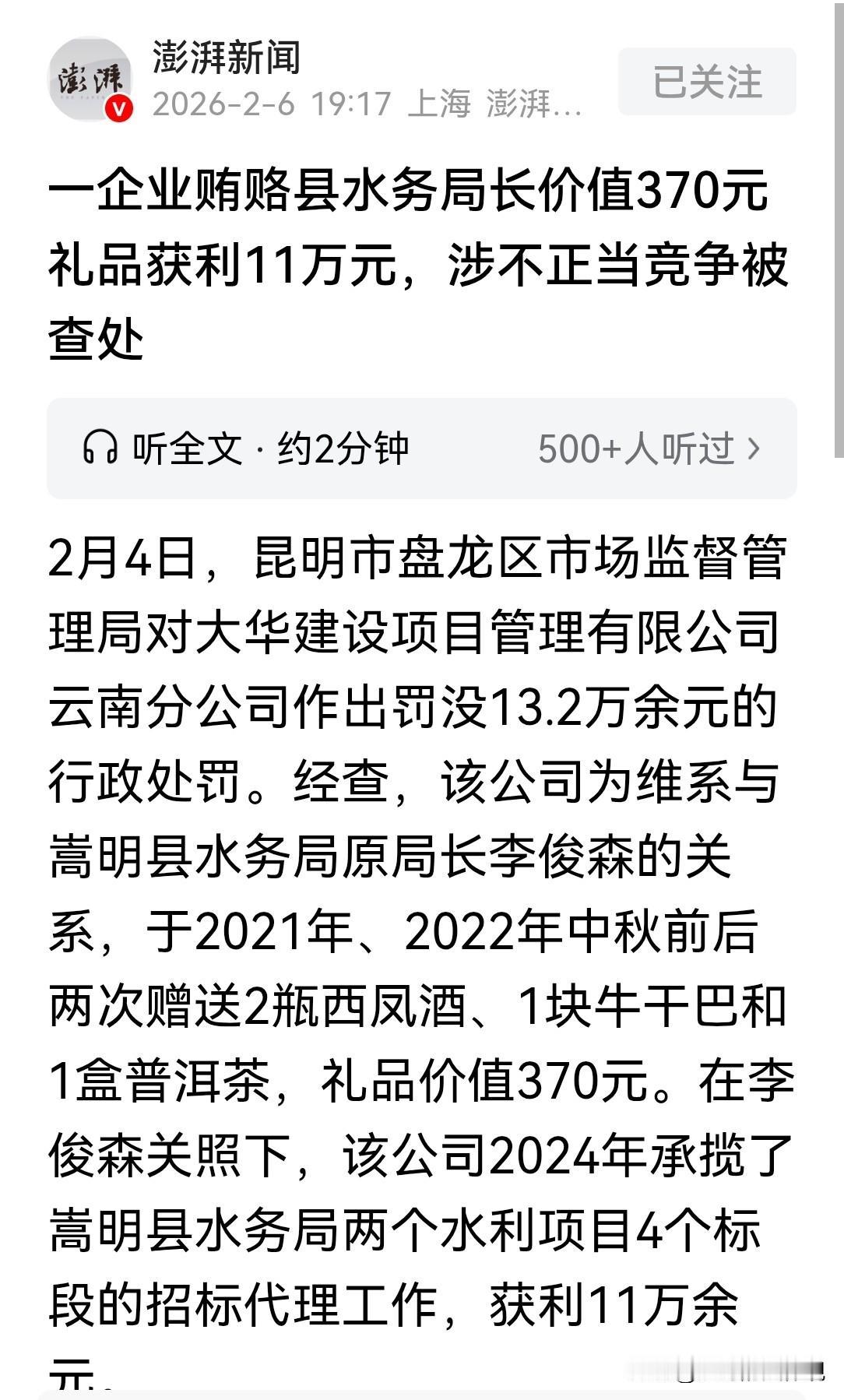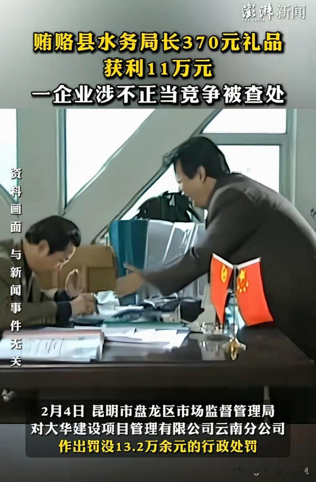 云南昆明,某企业为了揽点工程活,“2年”分“两次”给县水务局原局长,送了两瓶西凤酒、一块牛干巴、一盒普洱茶,总价值370元。该局长收下礼物后,帮企业承揽了两个水利工程项目,企业挣了11万多元。结果,水务局长因受贿被免去职务,送礼的企业因不正当竞争,被没收盈利所得11万多元,另外被罚20000元。网友:这个局长被人笑话了……  有家做招标代理的公司,规模不算大,生意不好不坏。 为了多接点工程项目,他们找到了水务局的局长李某。 业务人员认为,想拿到项目,不走关系恐怕不行,但怎么走,好像是个问题。 送钱,风险太大,数额小了拿不出手,数额大了公司也承担不起。 请人吃饭又太普通,再说吃过可能就忘了。 业务人员考虑了很久,决定拿出点小心意,不追求立刻见效,而是建立一种联系。 2021年中秋节前,他们觉得时机到了。 公司业务人员人给李某去买了点东西:两瓶西凤酒,一块本地的牛干巴。 东西不贵,加起来也就100来块钱。 业务员给李某打了个电话,话说得很委婉,大意是节前一点家乡特产,不成敬意,请领导尝尝。 电话那头,李某客气了几句,但也没有坚决拒绝。 公司业务员放下东西,简单问候一下就走了。 这之后,公司的业务还是老样子。 2022年中秋节,业务员又如法炮制。 这次又是两瓶西凤酒,和一盒普洱茶,李某收下了。 这两次送的礼品总价值共计370块钱。 其实业务上送这些东西的时候,心态也是非常复杂的。 这点东西能换来一个大项目,那不太现实。 但这是一种必要的“情感投资”,是一种表达尊重和拉近关系的方式。 是办事的一种潜规则,或者说人情世故。 2024年,水务局有两个水利项目要启动。 一个是上游水库除险加固工程,另一个是应急补水工程,加起来一共有4个标段需要招标代理。 消息在行业内传开后,送礼的公司也听到了消息。 他们联系了李某,介绍了公司最近的情况和优势。 不久之后,事情就定了下来。 没有经过公开的竞争性选拔程序,该公司云南分公司直接拿到了这两个项目,全部4个标段的招标代理。 过程得来的顺利,公司之前两次总共370元的心意,好像是起了作用的。 或许李某在关键时候说了一句话,或者点了一下头。 项目做完后,给公司带来了 实际获利112651.92元的净利润。 公司觉得这是一笔非常划算的投资,回报率惊人。 然而,谁也没想到,事情的发展急转直下。 可能公司拿到项目的方式,引起了其他竞争对手的不满。 也可能在其他环节露出了马脚。 总之,昆明市监局接到了相关线索,开始了调查。 调查人员上门时,公司还他认为,就送了点酒和茶叶,价值300多块钱,这算什么大事? 连请吃顿像样饭的钱都不够,怎么能算行贿呢? 但执法人员看问题的角度完全不同。 他们问了一系列关键问题,最后得知,购买礼品的钱是公司出的。 购买的目的,是为了和李某维持良好关系,希望因此在水务局的项目上获得关照。 而李某是这两个项目的招标单位负责人。 公司因为这种关系顺利拿到了项目,通过这个项目公司赚到了利润。 当公司资金、商业贿赂、谋取竞争优势、违法所得这些法律概念,和那总价370元的礼品联系在一起时,事情的本质彻底变了。 它不再是无足轻重的人情往来,而是确凿的、以不正当手段,破坏市场公平竞争秩序的行为。 调查结论很清楚,涉事公司,触犯了,禁止商业贿赂的规定。 尽管贿赂的财物价值不高,但其目的明确:为了获取交易机会和竞争优势。 并且实际造成了排除其他竞争者的后果,获得了非法利益。 因此,执法部门决定:没收公司的全部违法所得,112651.92元。 同时,对公司处以20000元的罚款。 两项加起来,罚没款总计132651.92元。 这意味着,公司为这两个项目忙碌一场,所有利润化为乌有,还额外赔进去20000元。 而且,这个行政处罚决定,会记录在企业的信用档案里,成为公司的一个污点。 几乎在同一时间,另一边的处理结果也公布了。 李某被免去县水务局局长职务。 很显然,这与他违规收受管理服务对象的财物,不无关系。 可因为收受那总价370元的礼品被免职,总之是不体面的。 根据《反不正当竞争法》第7条:经营者不得采用财物或者其他手段贿赂下列单位或者个人,以谋取交易机会或者竞争优势:(三)利用职权或者影响力影响交易的单位或者个人。 招标代理公司,为了拿到水务局的项目,向局长送礼品。 虽然礼品价值仅370元,但目的是为了维持良好关系,从而在项目招标中获得关照。 这就是典型的试图通过财物贿赂,来谋取交易机会的行为。 这种行为对于其他遵守规则、靠正当竞争的企业来说是不公平的。 不管贿赂财物价值多少,只要有这种为谋取交易机会,而贿赂的行为,就要受到相应处罚。 对此你怎么看?
