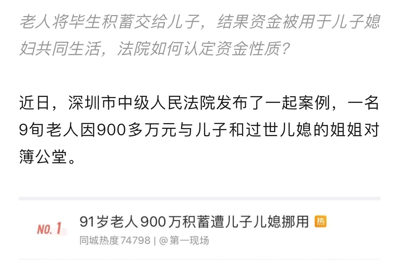 太多人名了…看了好几遍 才搞清楚……老太太的钱 让儿子保管,结果成了儿子夫妻的共有财产,儿媳立了遗嘱 其中一部分给了儿媳的姐姐。 现在老太太觉得这不对,想要回来,结果要不回来了……… 本来就是老太太的钱啊……儿子拎不清, 说句不好听的,老太太不在了钱还是她的。91岁老人900万积蓄遭儿子儿媳挪用