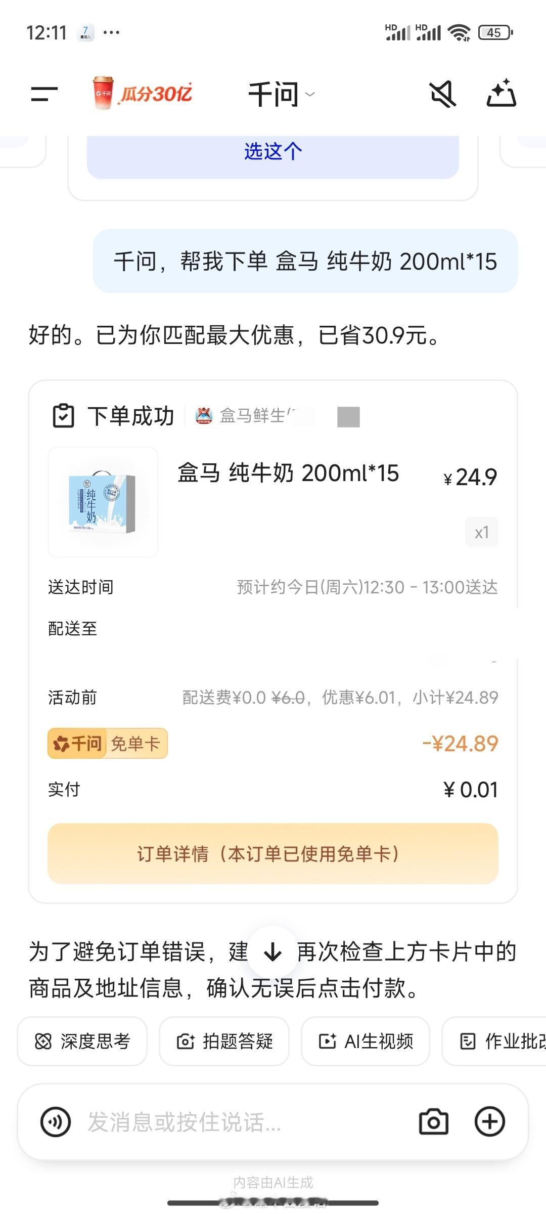 千问免单卡可以买年货没想到千问给的免单卡不止能买奶茶还可以买年货!我刚试着买了一箱牛奶只付了0.01💰,真的太香了!下载千问app,扫图二领取优惠,再让千问帮你找你想要的东西就OK了。