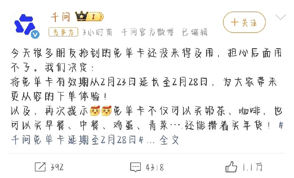 昨天起,你是不是也被千问的“春节30亿免单”疯狂刷屏了?好多朋友闹钟定好、手机握牢,就为对准那句“千问,请帮我点杯奶茶”毕竟25元无门槛免单卡,谁看了不迷糊!可这波全民狂欢刚热启动,不少小伙伴也遇到了甜蜜的烦恼:有人点单时被系统卡出去十几次,有人抢到卡却发现心仪的奶茶店排到几百号开外,还有人手里攒了好几张卡,盯着2月23日的有效期开始倒计时,生怕一不留神就过期了…… 别急别急!千问今天一早就送来好消息——免单卡有效期从原来的2月23日,延长到2月28日啦!这波操作真的超贴心,毕竟活动上线才9小时,订单量就冲破1000万单,全国30多万家合作门店简直被“点爆了”。济南有奶茶店门口堆成订单墙,骑手小哥说要等100多号才能取;重庆不少门店一天狂接1400多杯,店员忙得连电话都接不上……也难怪大家抢了卡却挤不进“下单通道”。现在多了5天有效期,咱们真不用赶着扎堆,错开高峰,舒舒服服喝一杯不香吗? 另外还要悄悄告诉你一个隐藏用法:这张免单卡,可不只是用来喝奶茶咖啡的哦!早餐的包子豆浆、午餐的家常小炒、家里的鸡蛋青菜,甚至过年要备的年货礼盒、零食生鲜,统统都能用它抵!每人最多能领21张卡,合起来525元呢,留着置办年货能省下一大笔~操作也特简单,不用跳转多个App,直接在千问里跟AI说“帮我买点年货”“来份减脂午餐”,它就自动连通淘宝闪购、盒马这些平台,用免单卡直接抵扣,最低只要付1分钱就能搞定。 可能有小伙伴遇到过系统卡顿、邀请好友后卡没到账的情况,官方已经紧急扩容服务器了,还开通了客服通道,凭截图就能申请补发。另外提醒一下,每天发卡数量有限,但平台会看情况追加,没抢到的朋友也别灰心,后面还有机会。现在有效期放宽了,大家完全可以慢慢安排,想喝奶茶就避开早高峰,想囤年货就等过年前两天再下单,怎么轻松怎么来。 其实这次免单卡的设计,本来就是想覆盖咱们生活的各种场景,不止请你实现“奶茶自由”,更是帮你搞定过年期间大大小小的需要。不管是日常点餐、超市补货,还是准备年夜饭、买年货走亲戚,都能派上用场。现在有效期多了5天,再也不用焦虑“卡用不完”了,安心选、从容买,把每张免单卡都花在真正需要的地方~还没试过的朋友赶紧更新千问APP,已经领到卡的就放心揣好,这个春节的快乐,千问陪你一起承包啦! 来源:千问