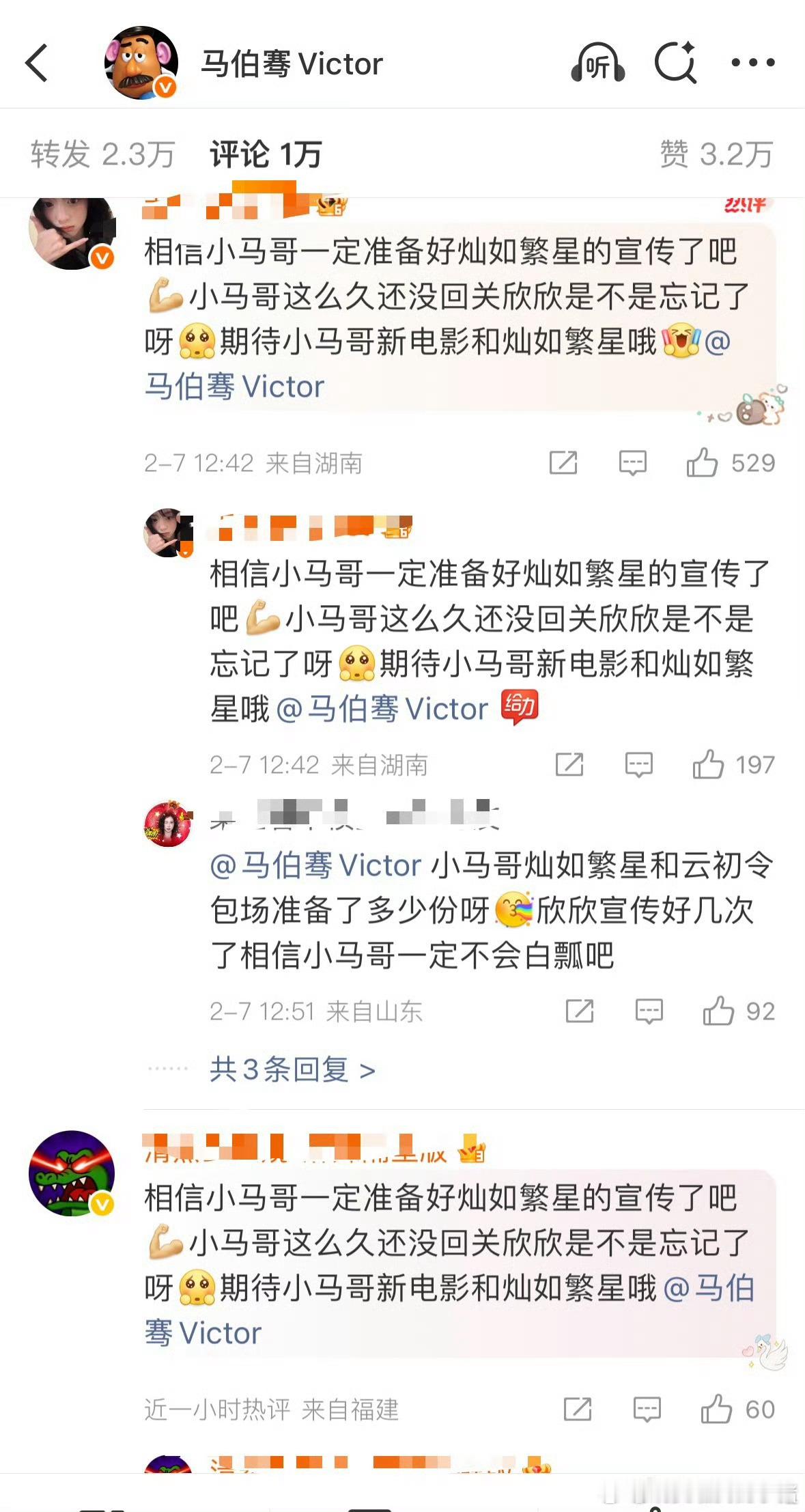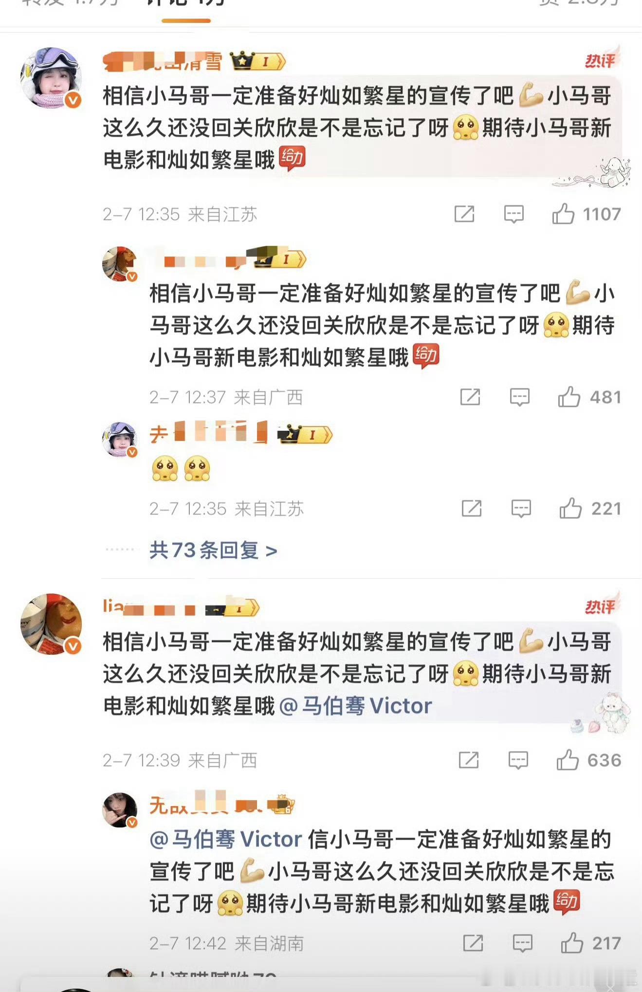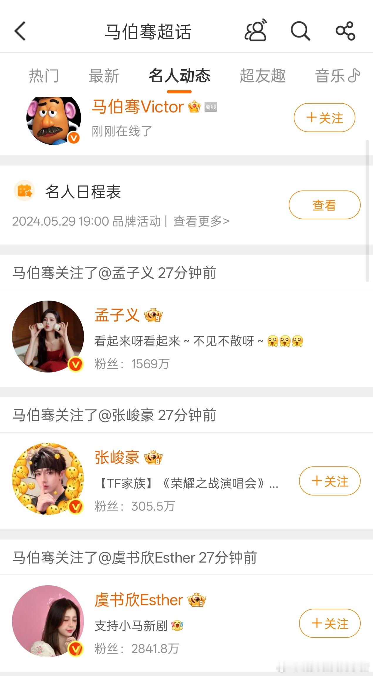 虞书欣粉丝喊马伯骞宣传新剧以及回关,说已经多次宣传了但并未回复,最后马伯骞上线顺便关注了虞书欣、张峻豪和孟子义,好不体面啊
