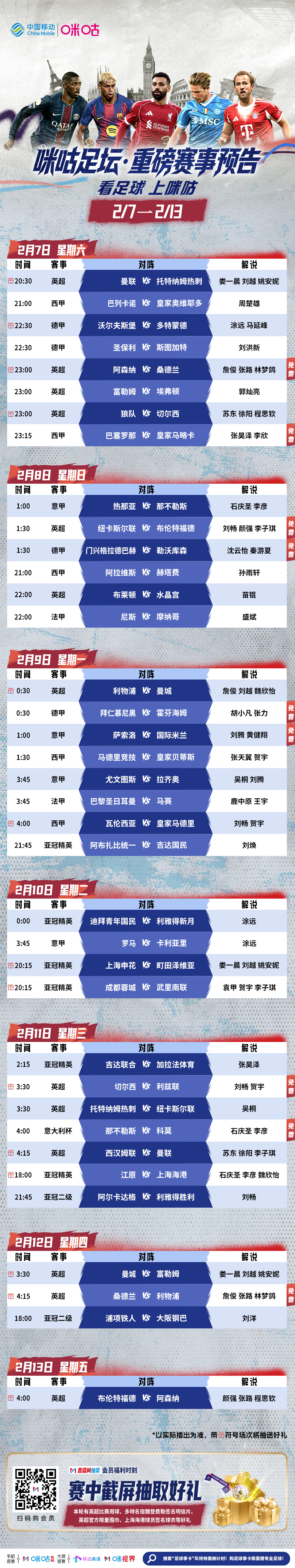 ⚽️ 重磅赛事预告𝟮.𝟳-𝟮.𝟭𝟯⚔️ 红魔战热刺⚡️红军蓝月决💥 法国的国家德比火爆来袭🏟️ 拜仁主场战黑马霍芬海姆🔥 亚冠精英联赛战火再燃起👀 #看足球上咪咕#