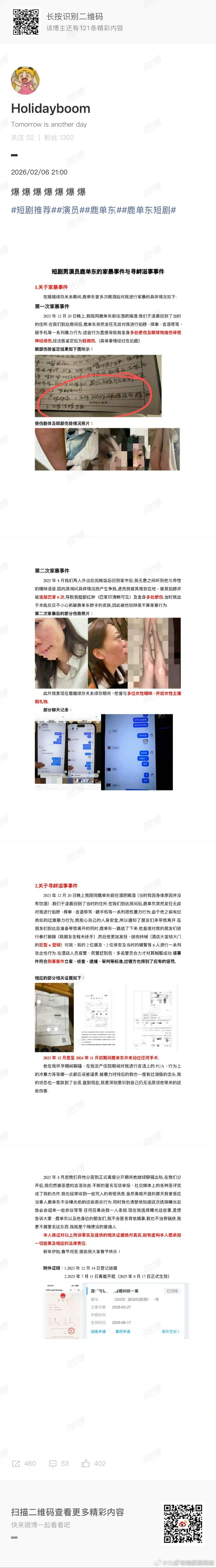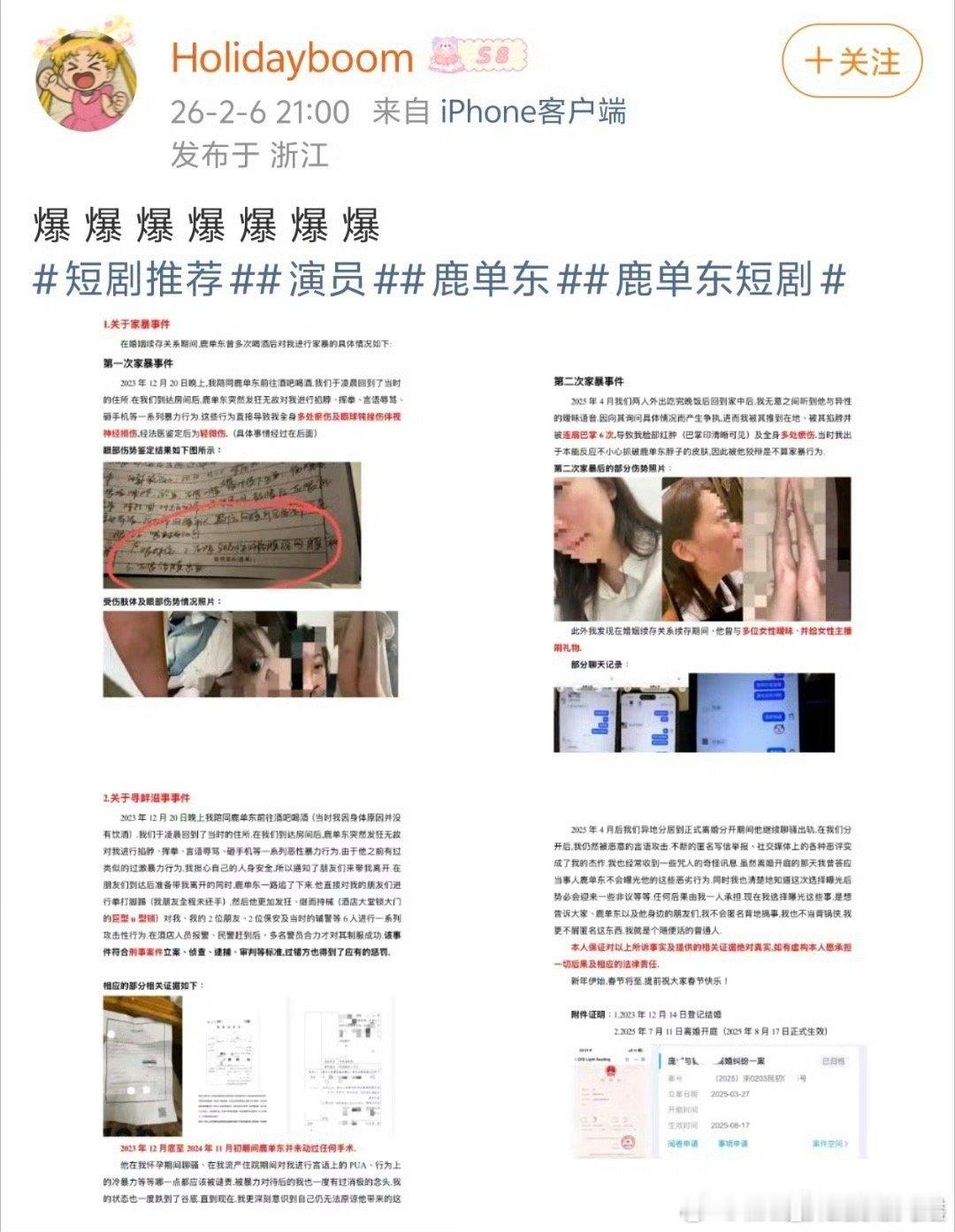 阎肃观察肃言肃语疑似前妻曝鹿单东家暴出轨短剧演员鹿单东的前妻公开指控其家暴、出轨等行为:2023年12月酒后家暴致其轻微伤,还引发寻衅滋事案;2025年4月再次家暴,并被曝婚内与多人暧昧、给主播刷礼物。此外,他在女方孕期、流产期实施精神伤害,离婚后仍恶意抹黑,女方承诺所述事实及证据真实并愿担责。鹿单东曾参演过多部短剧,《乡下真千金竟是老祖宗》《隐秘爱人》《一不小心撩错人》《世间万物不及你》《傅总的冷情罪妻》