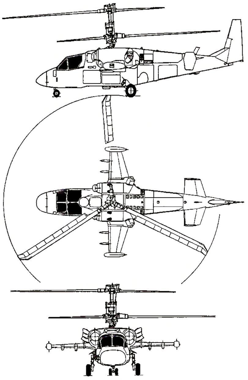 Ka-52直升机最显著的特点是采用并列双座布局的驾驶舱,而非传统的串列双座。该机有85%的零部件与已经批量生产的Ka-50直升机通用。Ka-52直升机装有1门不可移动的23毫米机炮,短翼下的4个武器挂架可挂载12枚超音速反坦克导弹,也可安装4个火箭发射巢。为消灭远距离目标,Ka-52直升机还可挂X-25MJI空对地导弹或P-73空对空导弹等。该机的动力装置为2台TB3-117 BMA涡轮轴发动机,单台功率为2200马力。