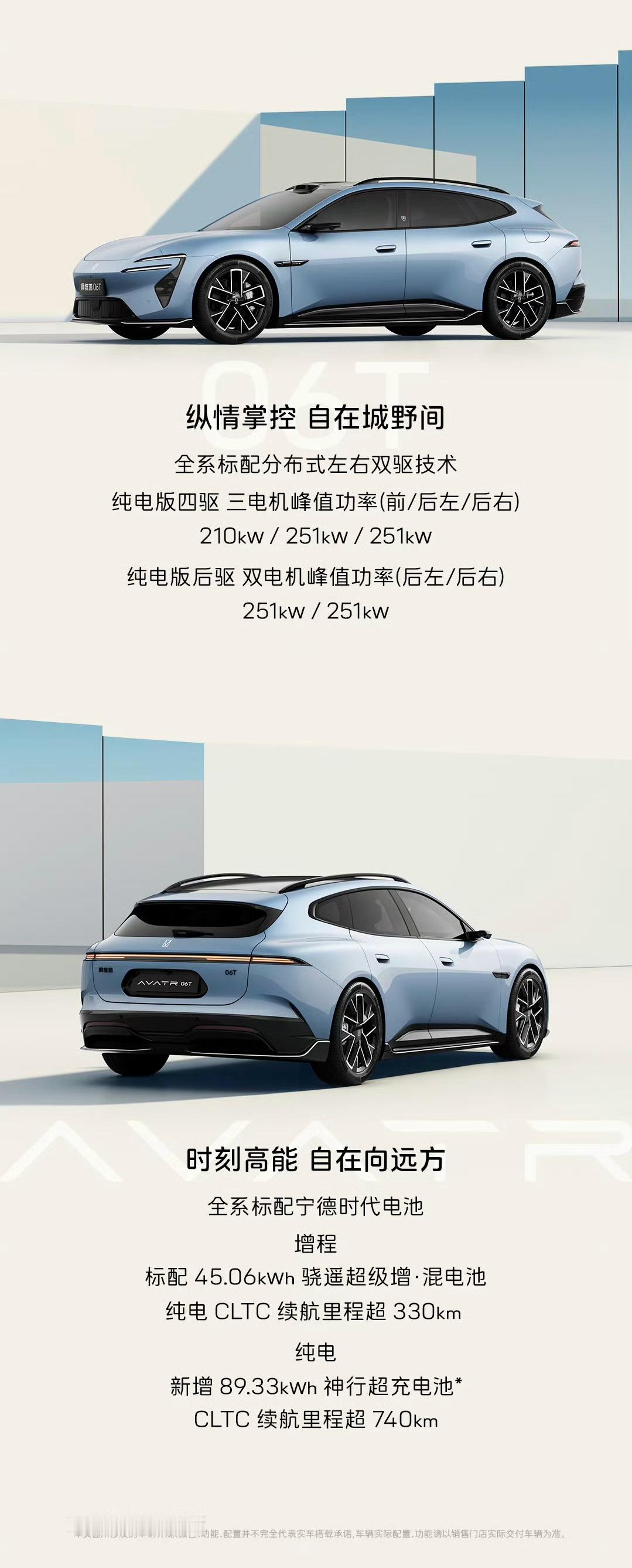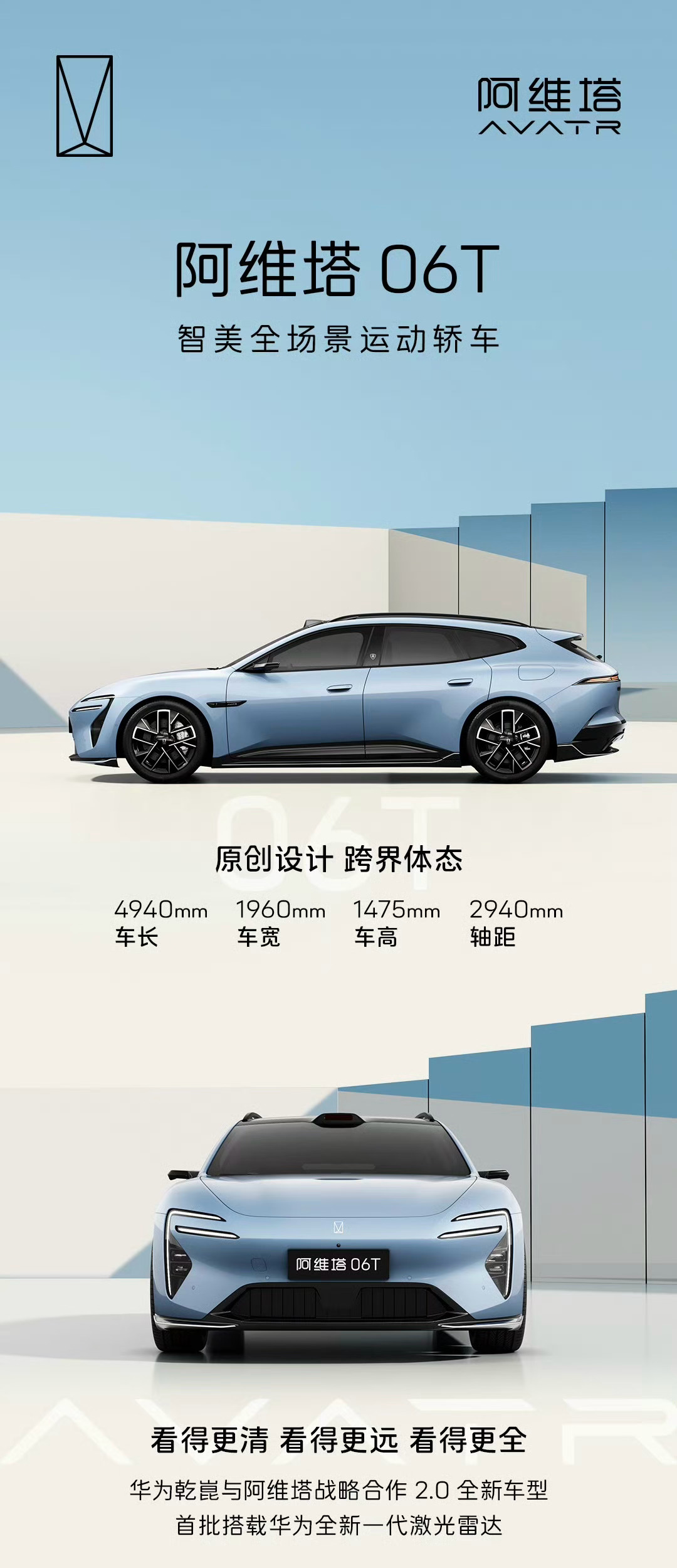 阿维塔06T轴距2940mm,车身尺寸适配家用与运动场景,全系标配分布式双驱、宁德时代电池,还搭载华为新一代激光雷达。