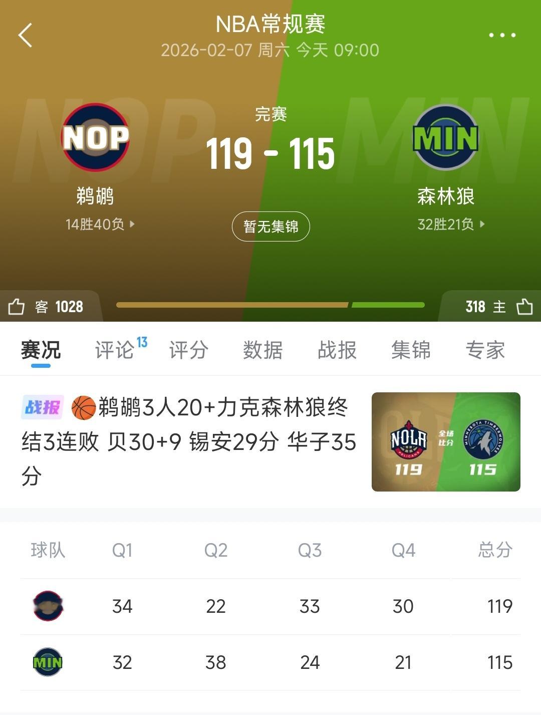 鹈鹕客场18分逆转战胜森林狼