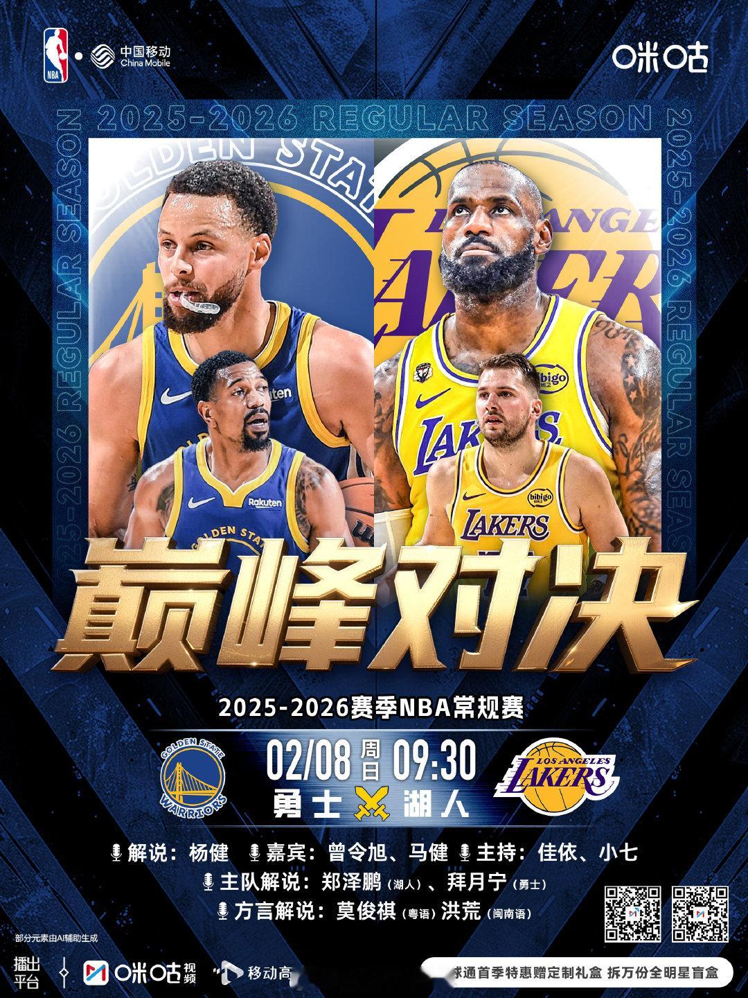 25-26赛季NBA常规赛⏰2月8日9:30 勇士vs湖人 ⛰️湖勇大战 巅峰对决📱看NBA上咪咕 网页链接 cr:咪咕体育