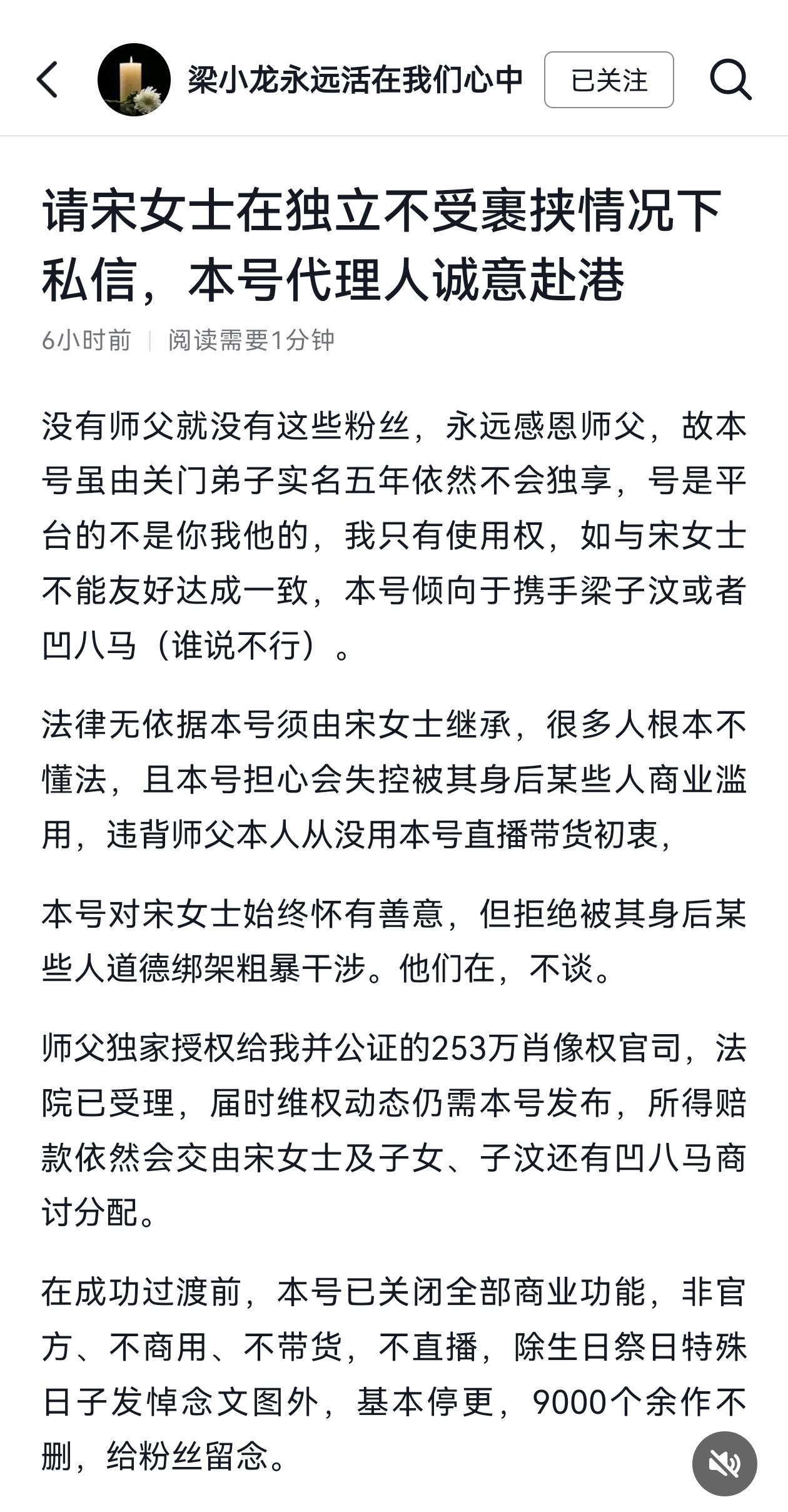 2月7日,梁小龙相关账号再次发文回应:“法律无依据本号须由宋女士继承,且本号担心会失控被其身后某些人商业滥用,违背师父本人从没用本号带货初衷。本号对宋女士始终怀有善意,但拒绝被其身后某些人道德绑架粗暴干涉。”文中还称:“本号已关闭全部商业功能,非官方、不商用、不带货、不直播,除生日祭日特殊日子发悼念图文外,基本停更,(近)9000个余作不删,给粉丝留念。”网页链接