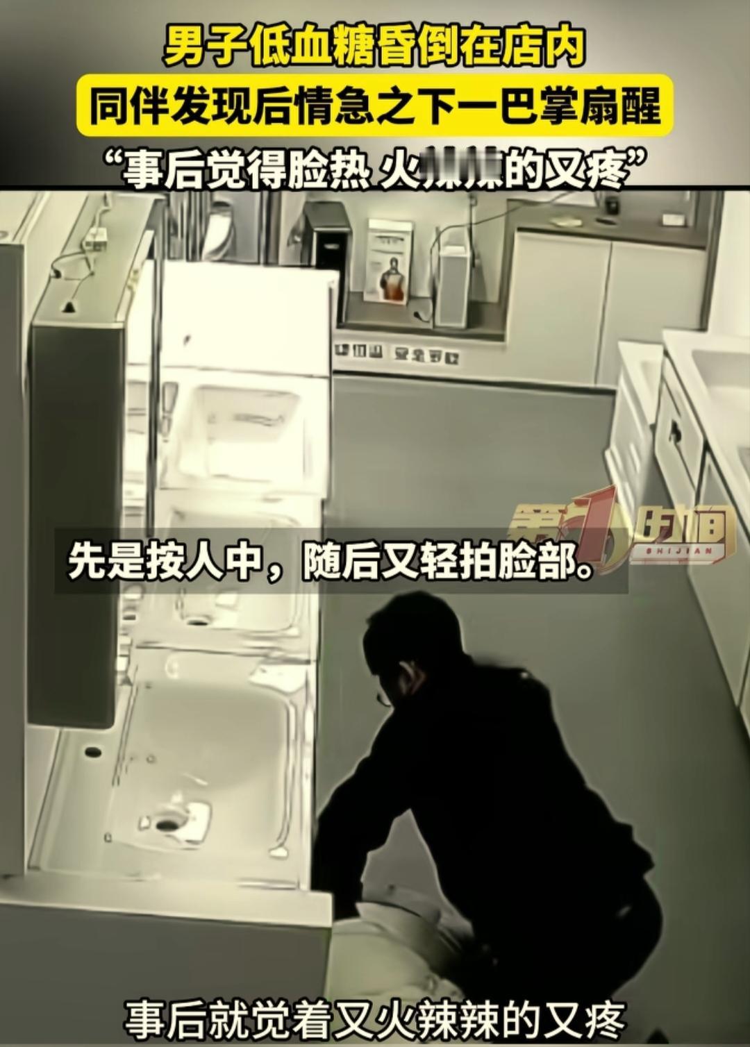 山东济南一男子低血糖晕倒,同伴发现后迅速跑过来,情急之下用了土法急救,一巴掌把男子扇醒了。 男子醒了后,先觉得脸热,后来才觉得得脸上热辣辣的疼。 男子知道是同伴一巴掌把自己呼醒后,和同伴打趣“是不是平时对自己不满意呀。” 低血糖时,大脑因缺糖“死机”,呼一巴掌和掐人中的效果类似,就是刺激神经,可以疼醒。 低血糖晕倒的原因是缺糖,所以补救方法就是赶紧补血糖。在患者有意识时,给他喝含糖的饮料或吃个糖果,这样的急救方法比较体面也更有效。 低血糖不能忽视,晕倒时身边没人很危险。如果知道自己有低血糖,随身带些糖果,觉得不舒服就含颗糖是最好的办法。不然万一同伴呼脸急救,虽然苏醒了,但脸疼半天还得真心实意的感谢人家。[大笑]