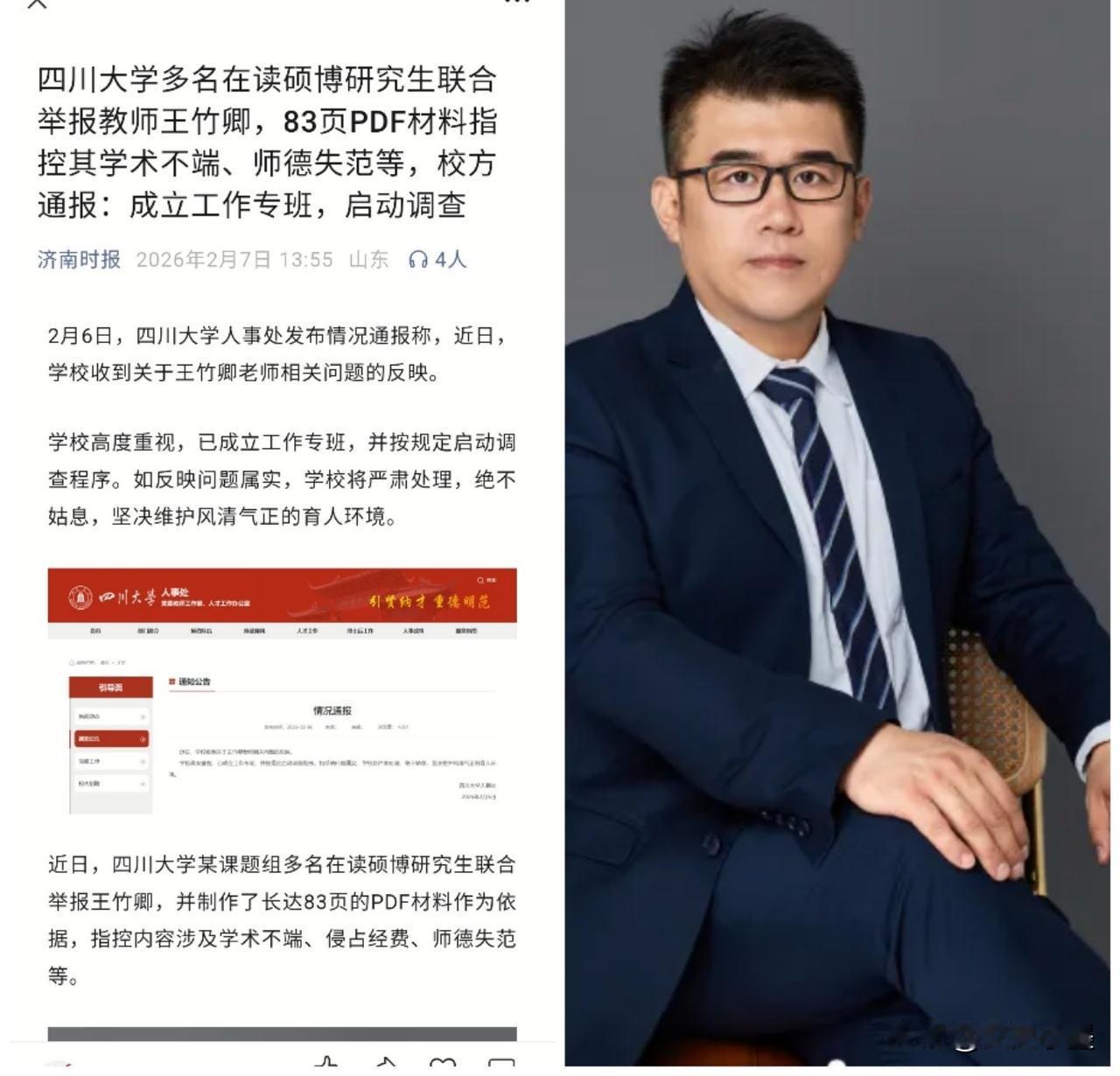 四川大学这名博导可能要凉了,毕竟是被这么多在读的硕博研究生联合举报,而且还制作了多达83页的证据材料做支撑,相信他大概率是有问题的! 这些材料主要是说明他学术不端、侵占经费、失德失范问题! 近年来,因为被学生举报而翻车的大学教师不在少数,问题也是五花八门,包括利益输送、插足婚姻等! 有些人虽然表面上光鲜耀眼,受人敬仰,但背地里却做了一些见不得人的丑事,有违其身份! 作为一名传道授业的高校教师,应该自身注重师德师风,行事规范合理,为自己带的学生树立一个好的榜样! 目前,四川大学已成立专班去调查此事,孰是孰非,相信很快就会有结果的!