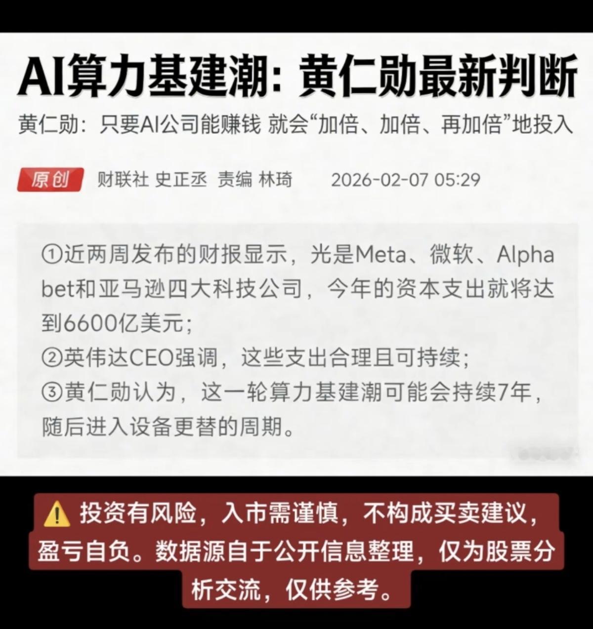 AI算力基建潮!黄仁勋最新观点! 黄仁勋认为,新一轮算力基建潮可能会持续7年!