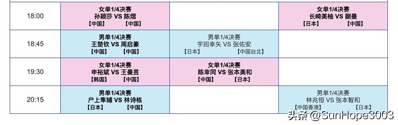 2.7日亚洲杯晚间赛程,孙颖莎王楚钦等晚上6点开始比赛。 亚洲杯的1/8决赛已经结束,晚上6点开始进行1/4决赛, 同时赛制也改为7局4胜,对于今天上午刚刚结束比赛的大家来说,对各自的体力也是一种考验。 孙颖莎vs陈熠,王楚钦vs周启豪, 这两场都是内战。 其他的国乒队员暂时都是外战。 中国队加油!