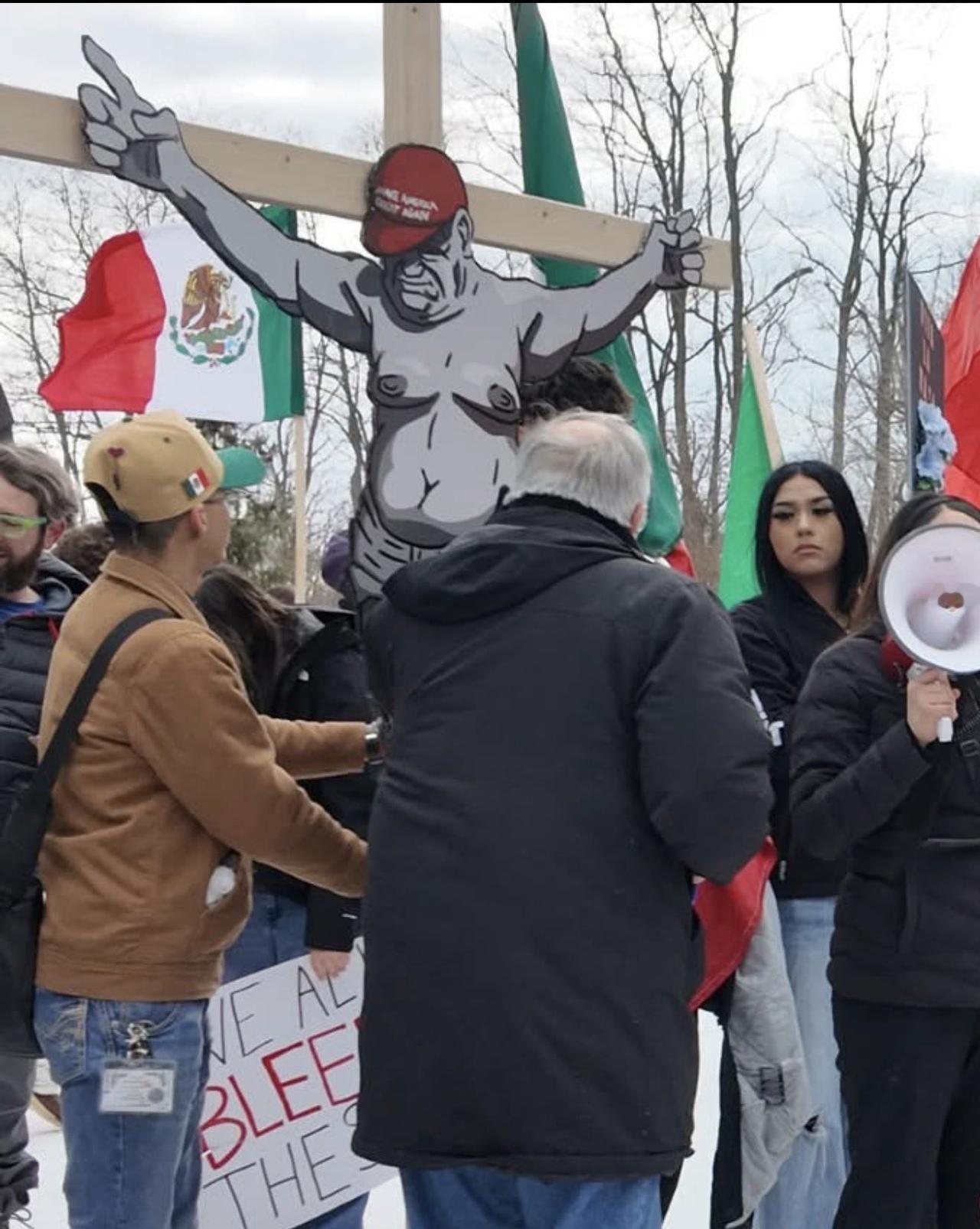 特朗普有点危险了:有人要把他钉在十字架上!2月6日,美国伊利诺伊州的沃基根高中举行了一场“反移民及海关执法局”抗议活动,现场展示了被钉在十字架上的唐纳德·特朗普画像。此前特朗普在自己的社交平台上海贴了一段结尾影射前总统奥巴马是猩猩的视频,在全美国引发轩然大波和强烈抗议。但是特朗普仍然死硬不悔改,虽然删了视频但不承认错误。特朗普再这么走下去,真的是要成为孤家寡人了……