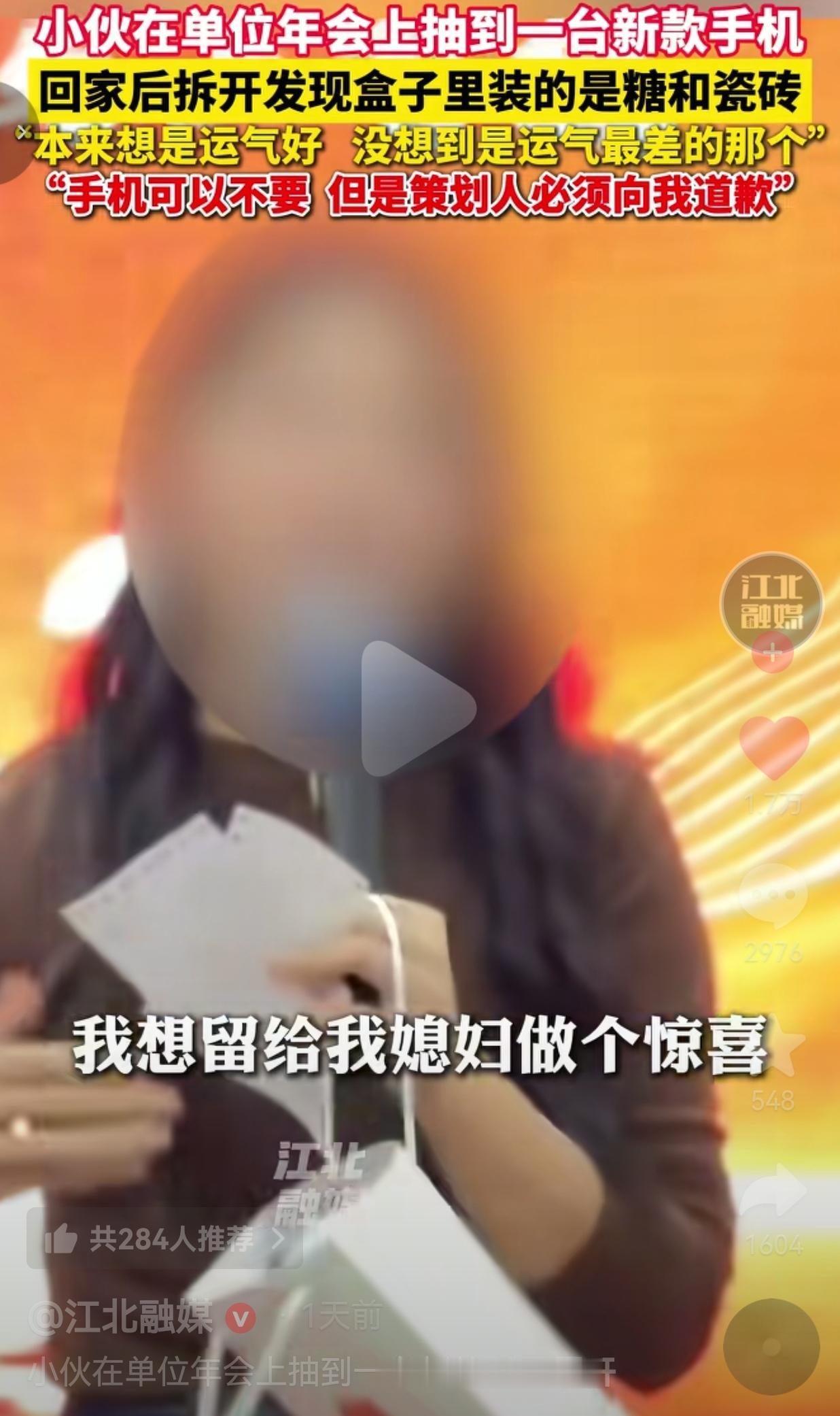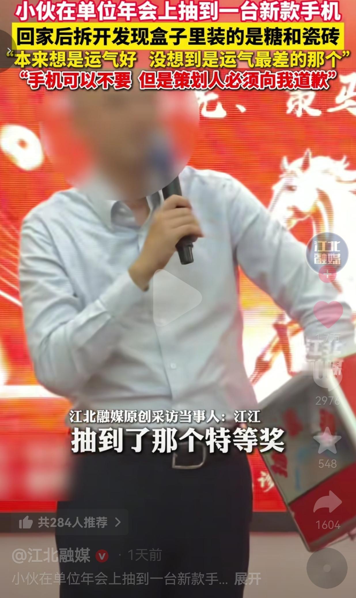 这不是恶搞吗?男子在公司年会抽中万元手机,回家等媳妇拆手机,想给媳妇一个惊喜,结果惊喜变恶作剧,里面是糖和瓷砖! 近日,广东珠海,一男子在公司年会抽中了特等奖,这个奖品是价值9988元的iPhone 17 Pro Max,连发票、POS单和手机包装盒都做得像模像样。 当时他心里乐开了花,以为自己爆棚了,公司的同事都带来羡慕的眼光。男子想来想去,想着要把这份惊喜留给媳妇,就忍住没当场拆开。 结果回家让媳妇亲手一拆箱,两个人都傻了。盒子里哪有什么新手机,只有几颗包着金箔的糖和两块冷冰冰的瓷砖! 男子在接受采访时说:“本来想是运气好,没想到是运气最差的那个。这个手机我可以不要,但是这个道歉我必须要。” 更让人气愤的是,男子后来得知这个策划人居然是他的科室主任,而且所有领导和同事对此都毫不知情。 主任后来承认这是他为了活跃气氛搞的鬼,还说不是针对他的。 此事引发了热议,有的网友说:“这哪是活跃气氛,这是纯纯欺负老实人嘛!手机可以不要,道歉必须要,换我我也不依!” 还有的网友说:“同事们都在投来羡慕的眼光,结果拆开是糖和砖,这社死程度,比没中奖还难受!” 要我说这已经不是简单的玩笑了,这是赤裸裸的欺骗。年会抽奖,本来是公司给员工的年终福利,是图个开心和彩头。 结果倒好,策划人把员工当猴耍,把信任当成了恶作剧的筹码。 最让人心疼的是,小伙子本来想给媳妇一个惊喜,结果惊喜变成了惊吓。这份委屈,比没中奖更让人难受。 同事们都以为他抱回了真手机,背地里不知道怎么羡慕呢?结果只有他自己知道,手里的大奖有多讽刺。 我们常说“职场如江湖”,但再怎么江湖,最基本的诚信和尊重不能丢。一个公司如果连年会抽奖都要弄虚作假,又怎么能指望员工真心实意地为它付出? 说到底,这件事不仅是对中奖者的伤害,更是对所有在场员工的不尊重。它寒的不是一个人的心,而是一群人的心。 对此,你怎么看?